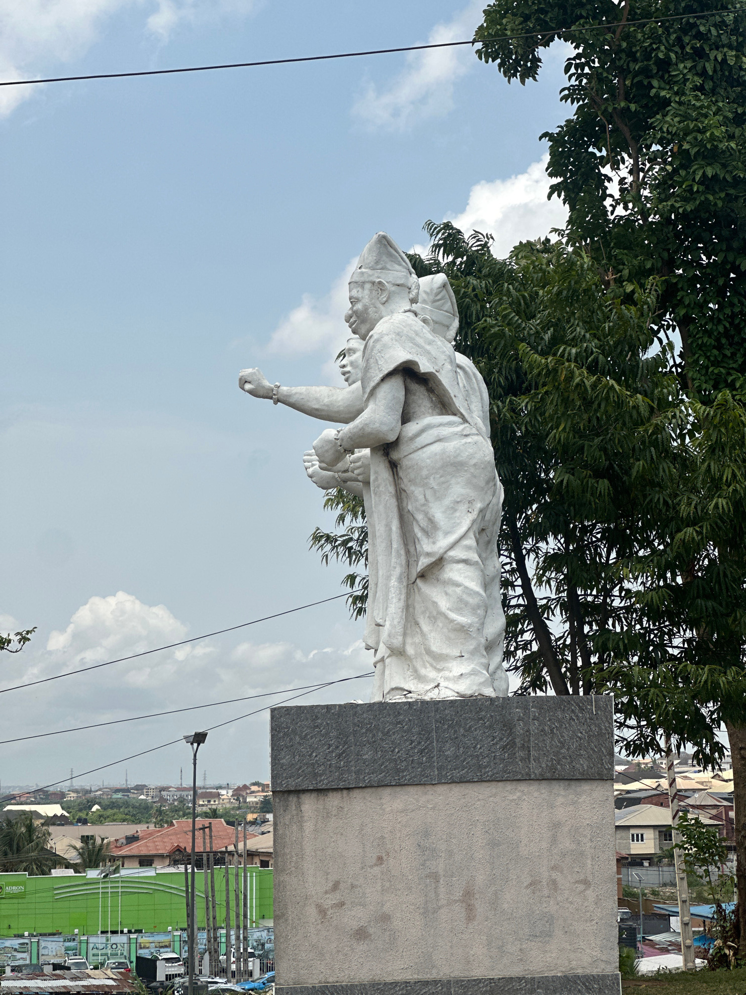 The image depicts a white marble statue of two figures, one supporting the other, situated in Ikeja, Nigeria. The statue stands on a rectangular gray stone base. Above and to the left of the statue ar…read more