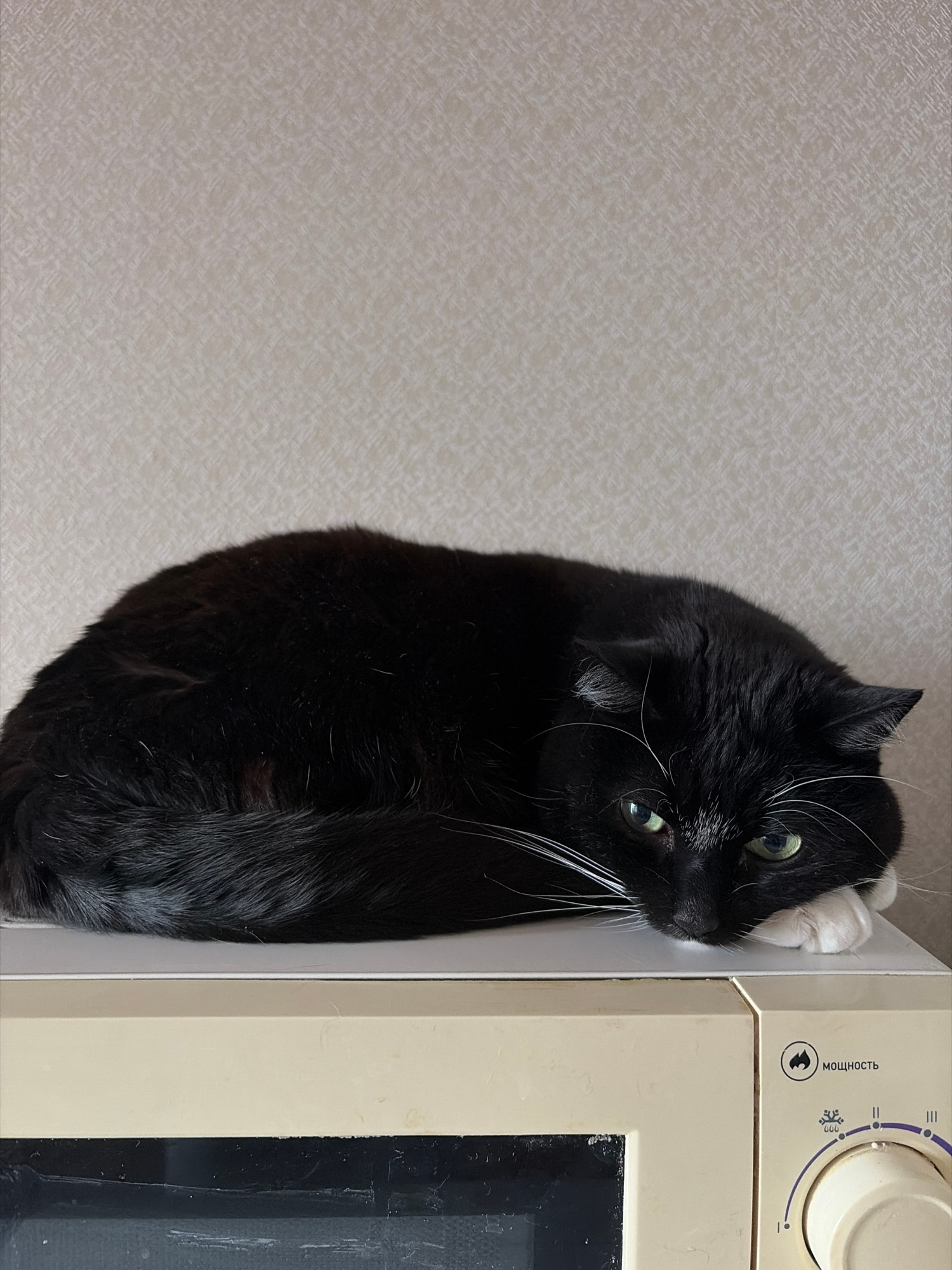 A black cat with white whiskers is positioned near the edge of a white or off-white microwave oven. The microwave has a round dial on its top-right, with text in Russian that includes the word "МОЩНОС…read more
