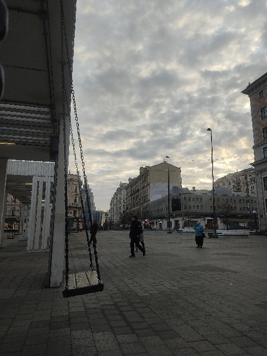 The image shows a street scene in what appears to be a city square. In the middle ground, two people are walking on a paved area, while in the foreground, a swing set is visible. The background featur…read more