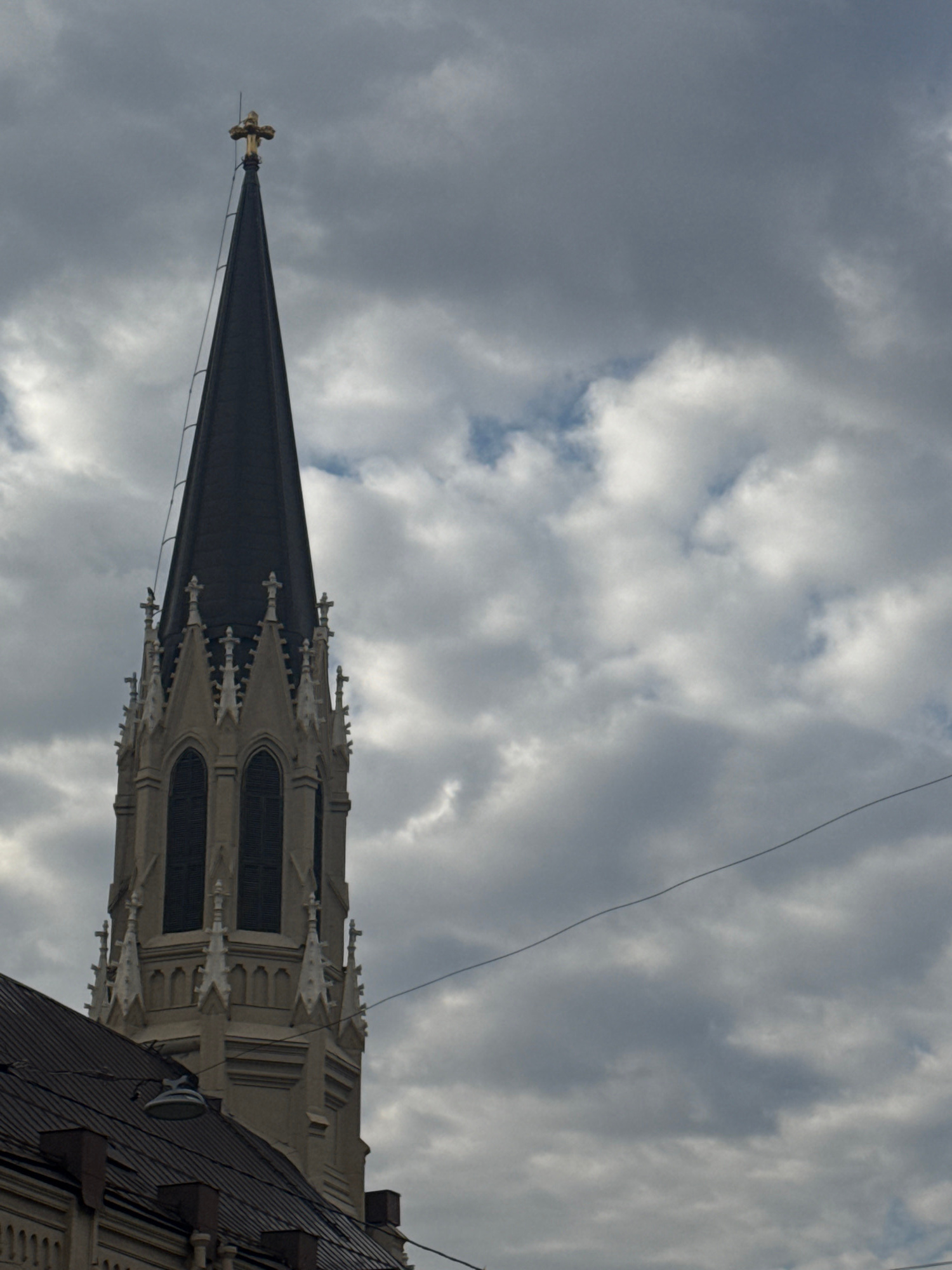 An upward-facing shot captures the intricate details of a tall, gothic-style church spire against a cloudy sky. The spire, predominantly dark grey or black, tapers sharply to a point, topped by a gold…read more