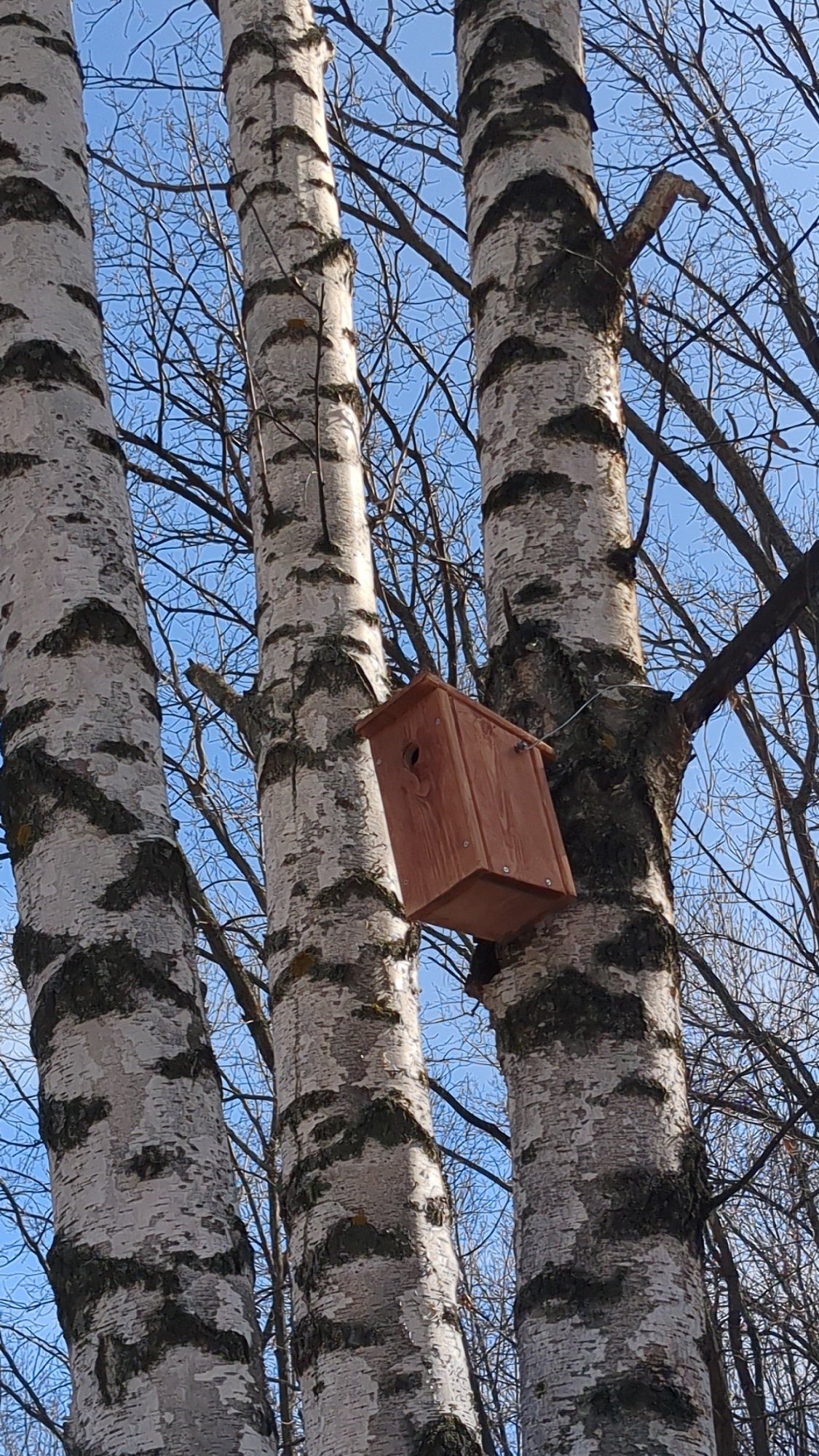 A wooden birdhouse hangs suspended by a metal wire from a horizontal birch tree trunk against a clear, bright blue sky. The birdhouse is made of light-colored wood, with visible screws and a circular…read more