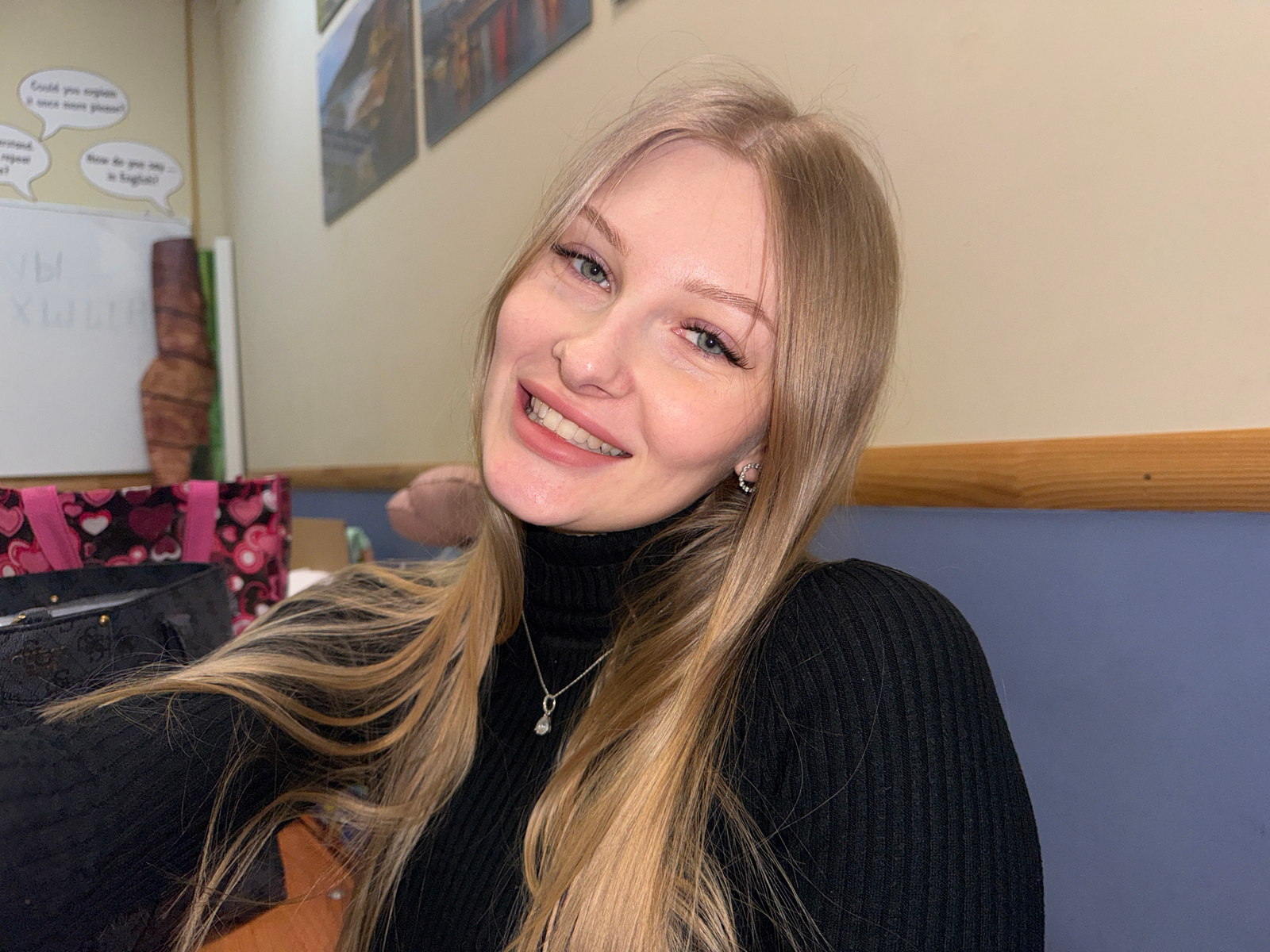 The image, presented upside down, features a young woman smiling and looking directly at the camera. She has long, straight blonde hair, blue eyes, and fair skin, with light makeup accentuating her fe…read more