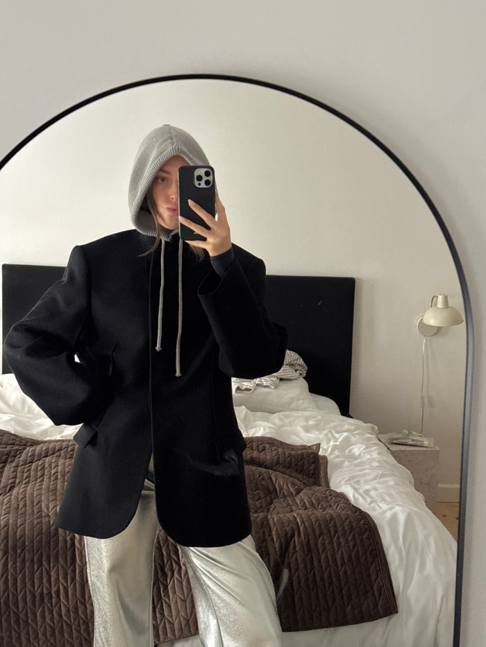 The scene depicts a mirror selfie taken indoors within a bedroom in Unknown, Unknown. A single individual, appearing female, is reflected in a large, black-framed arched mirror. She is dressed in a li…read more