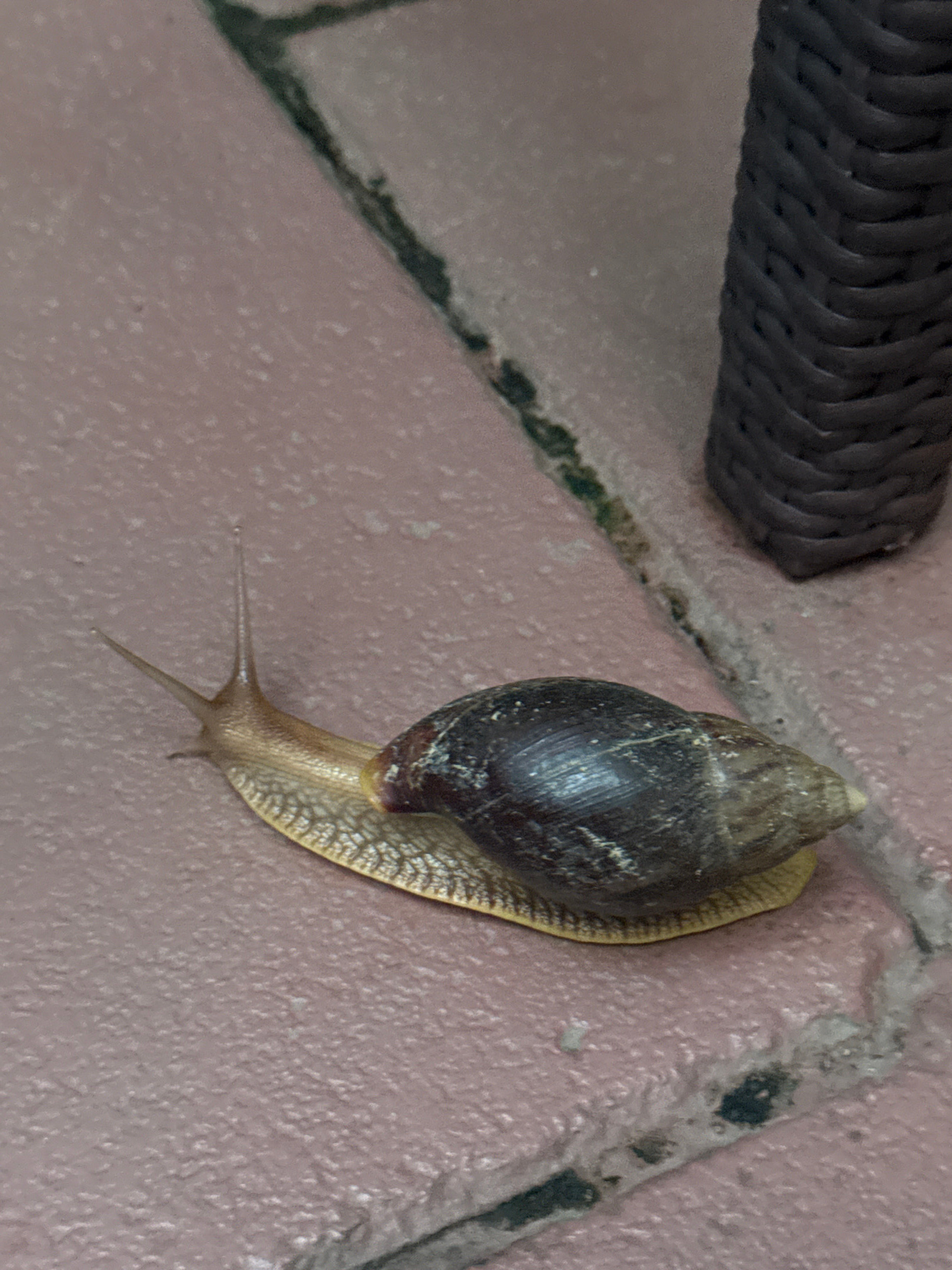 The image shows a snail on a tiled surface. The shell of the snail is dark in color, while the body is a light tan. The background consists of pinkish-tan tiles with visible grout lines. A dark braideβ¦read more