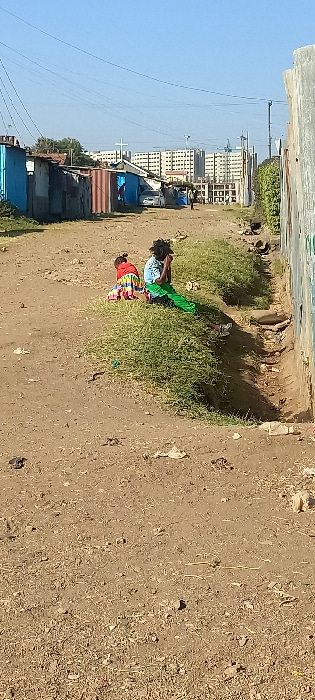 Two women are bent over amidst tall grass near a dusty path. The woman closest to the camera wears a colorful skirt, while the other sports a light blue top with green fabric draped nearby. Behind the…read more