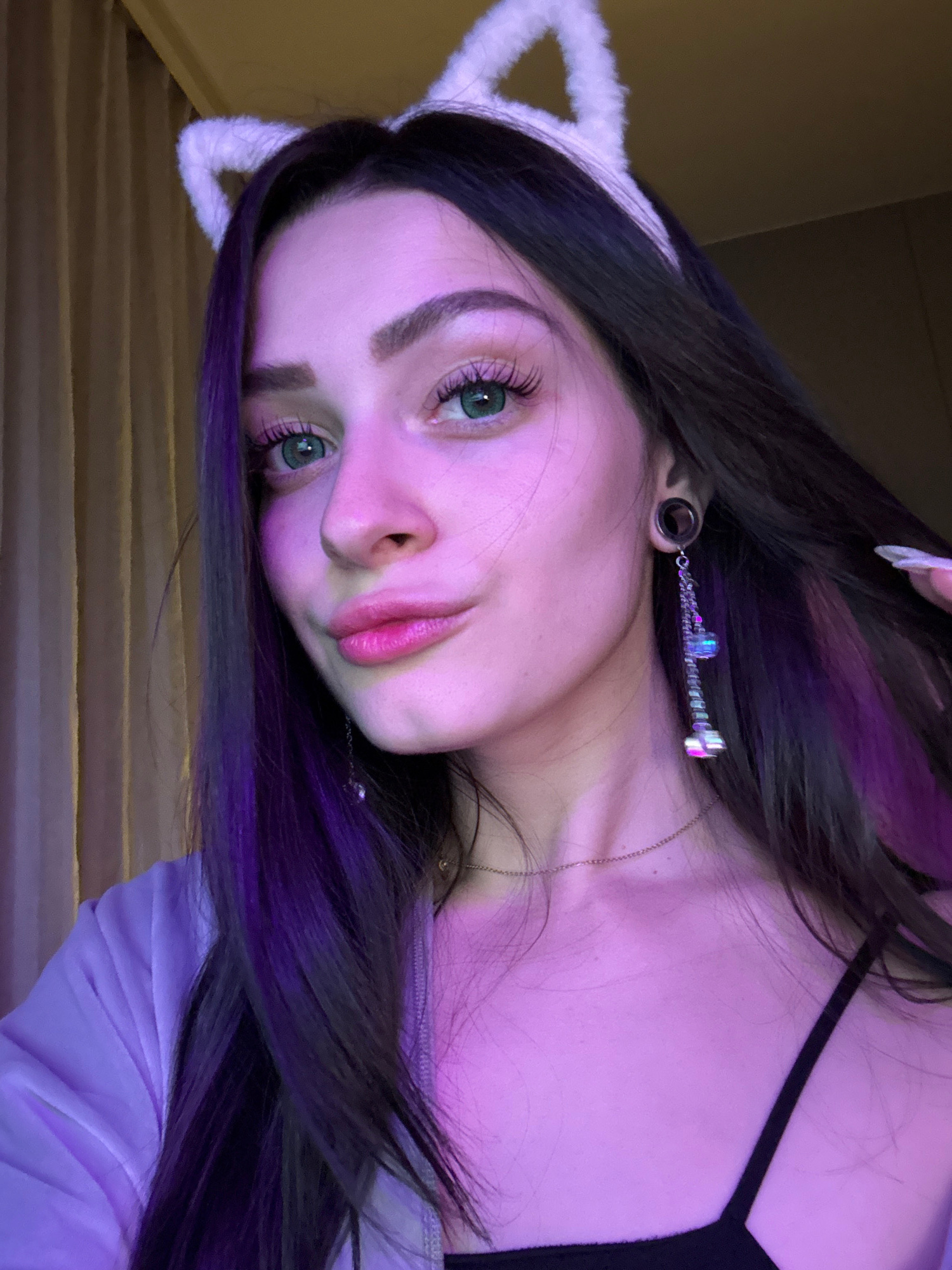 A young woman with long, dark hair highlighted with purple stands against a backdrop of a blurred, neutral-toned wall. She wears white fuzzy cat ears and a long, dangling earring on one ear; her earlo…read more