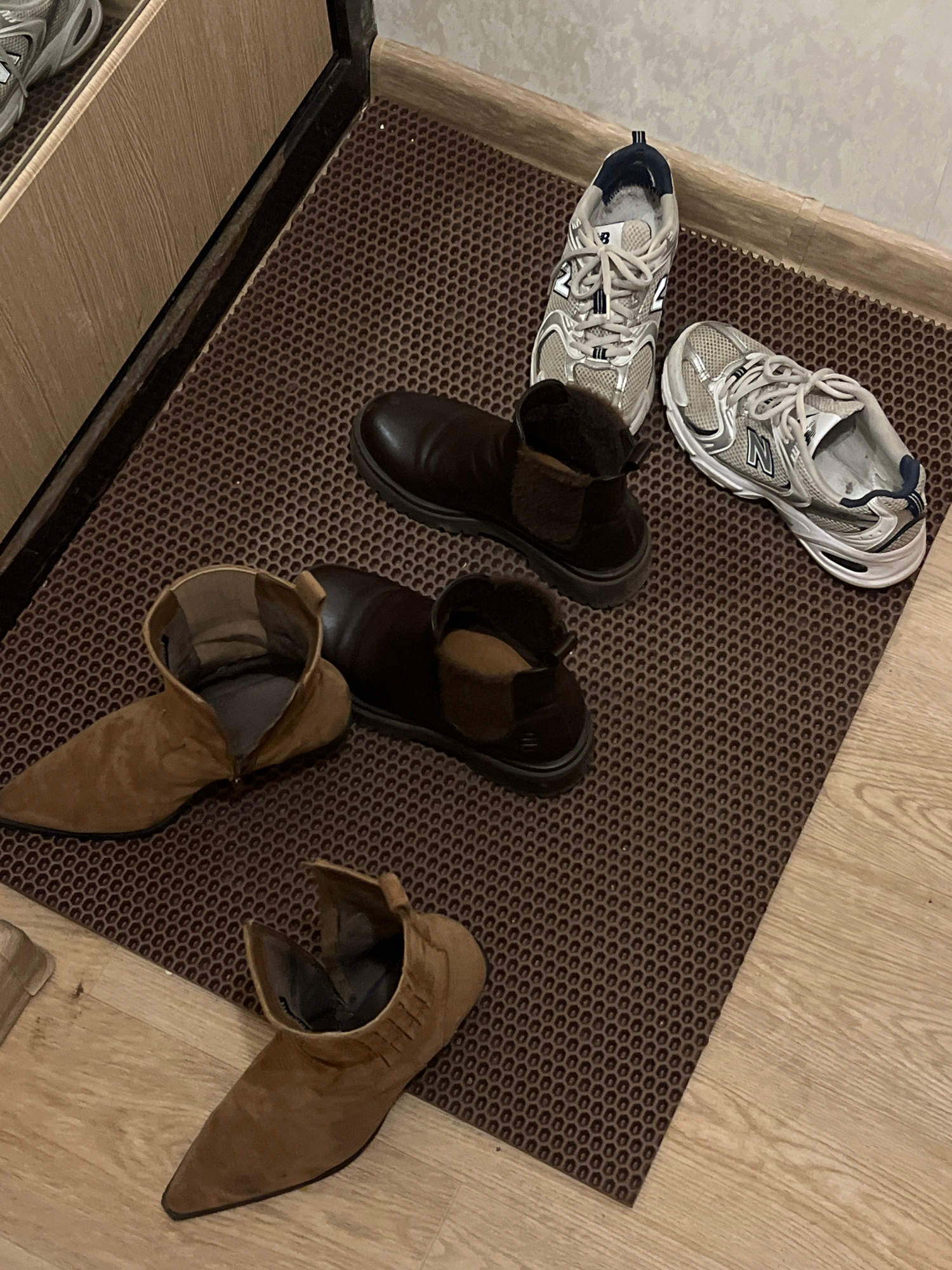 A top-down view shows a brown patterned doormat with an assortment of footwear on it. Two pairs of light-colored running shoes are in the upper left corner. Two pairs of short brown boots are position…read more