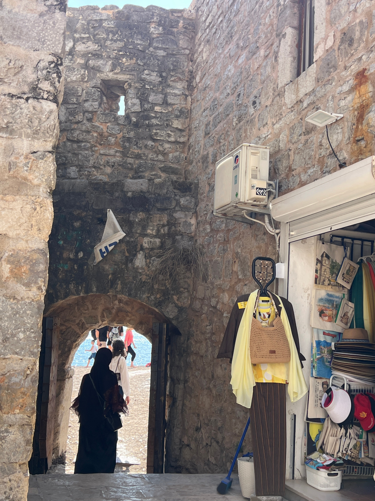 The image displays an outdoor scene within an ancient stone structure or alleyway in Budva, Montenegro, under bright daylight. The walls and ceiling are constructed from rough-hewn grey stones, charac…read more
