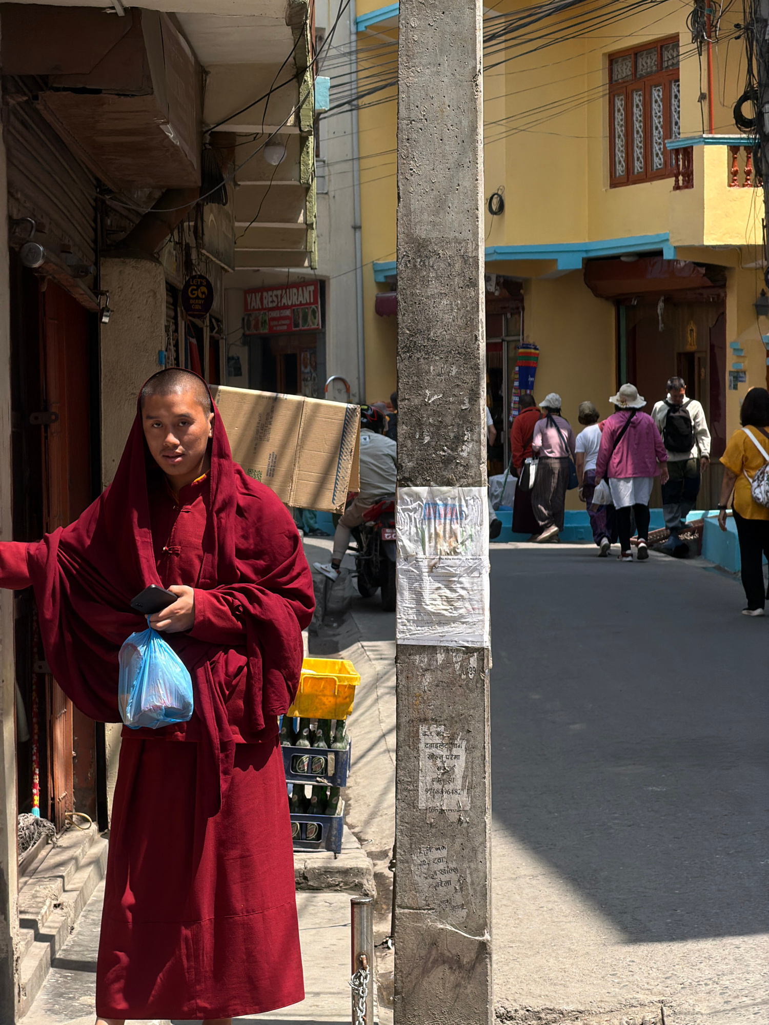 A monk in maroon robes stands in the Kathmandu Metropolitan City, Nepal. He is holding a blue plastic bag and a smartphone. A concrete pillar behind him is plastered with paper debris. Behind the pill…read more