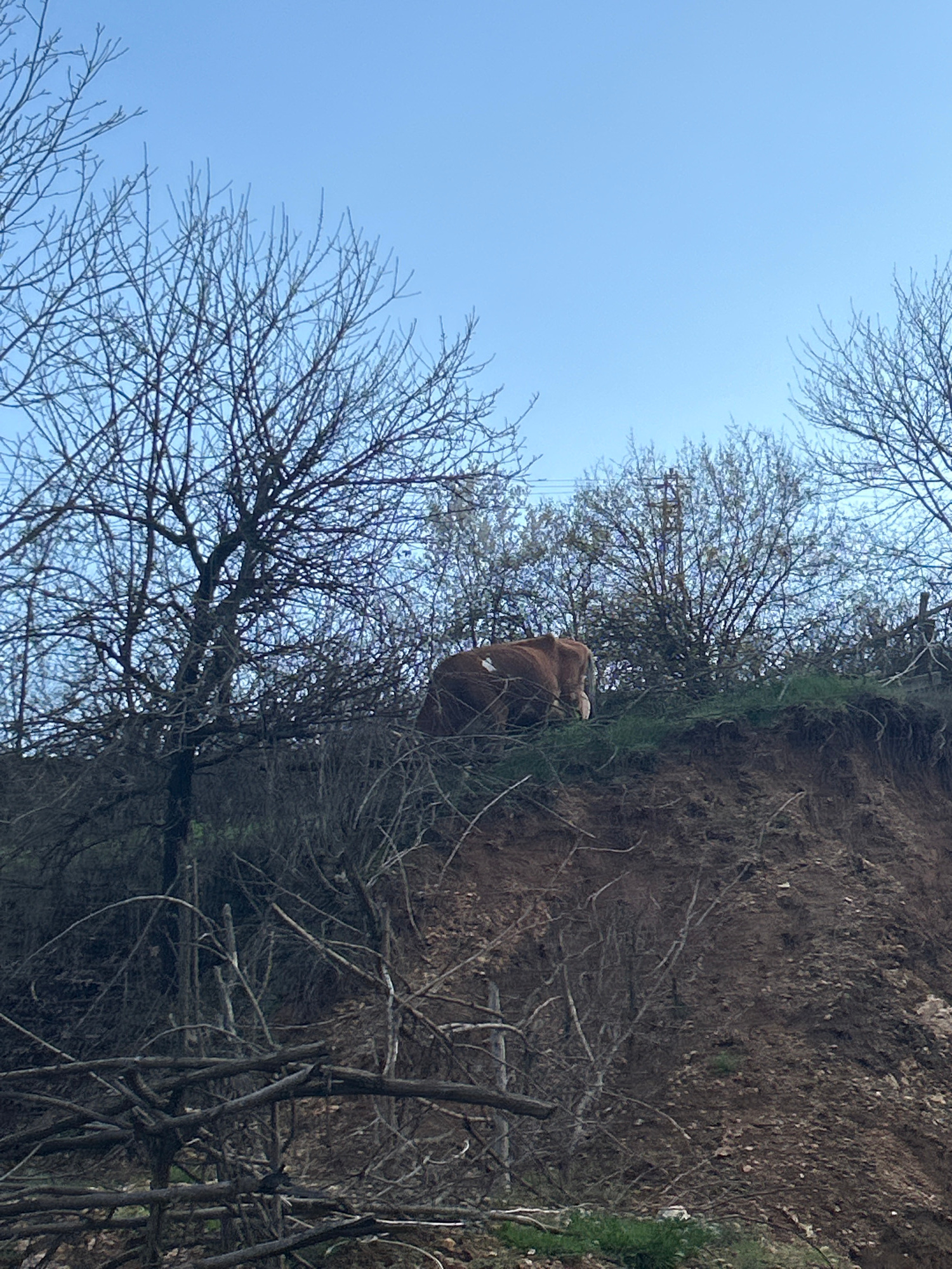A brown cow is perched precariously on a steep embankment in what appears to be a rural area of Zlatograd, Bulgaria. The embankment, composed of brown earth and sparsely covered with grass, rises shar…read more