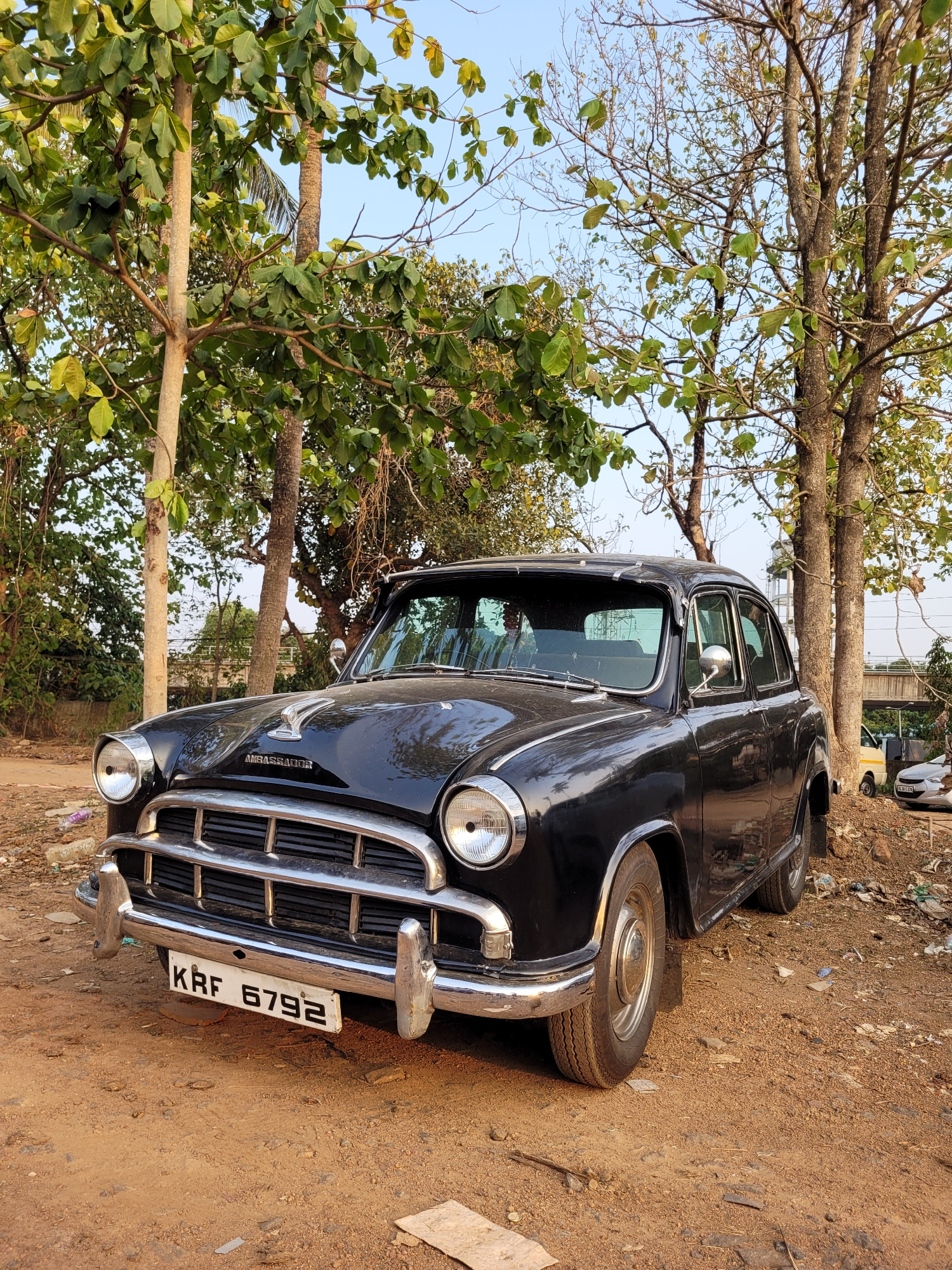 The image shows a black vintage car parked near trees on a dirt surface. The car has a chrome grill and visible headlights. The license plate reads "KRF 6792". The location appears to be a roadside arβ¦read more
