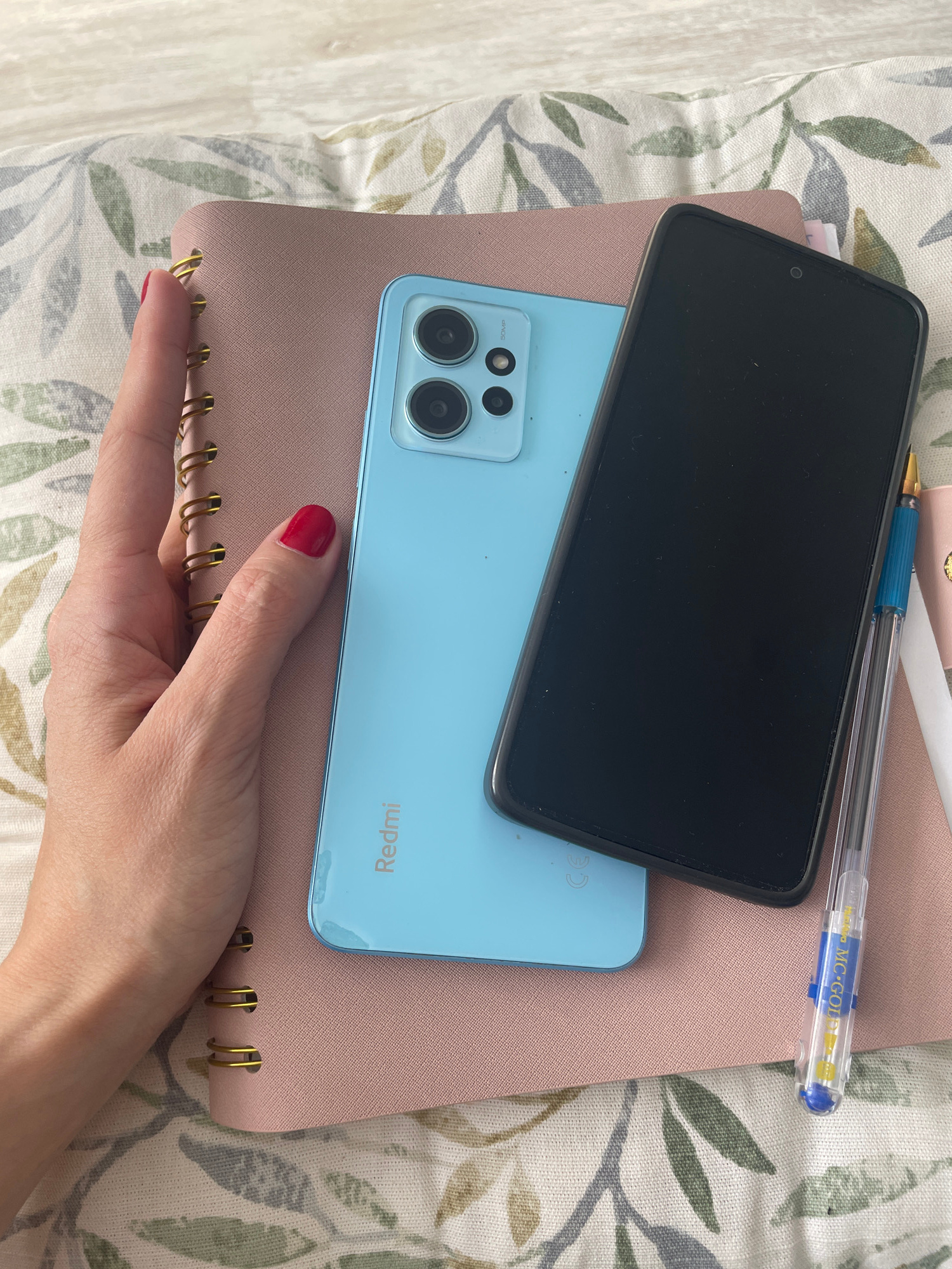 The image displays an overhead view of several personal items arranged on a light-colored fabric surface, which features a subtle pattern of green and gray leaves. At the center, a black-faced smartph…read more