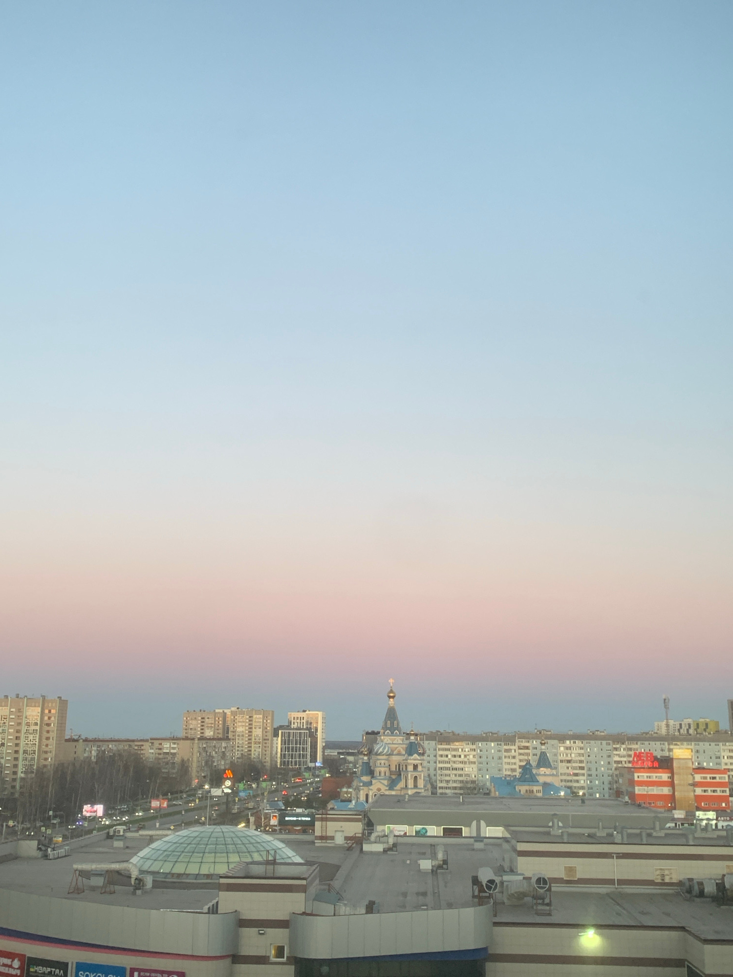 The image shows a cityscape at dusk in Izhevsk, Russia. The sky transitions from light blue to pink over the urban area. Buildings of varying heights and architectural styles fill the frame. A church…read more