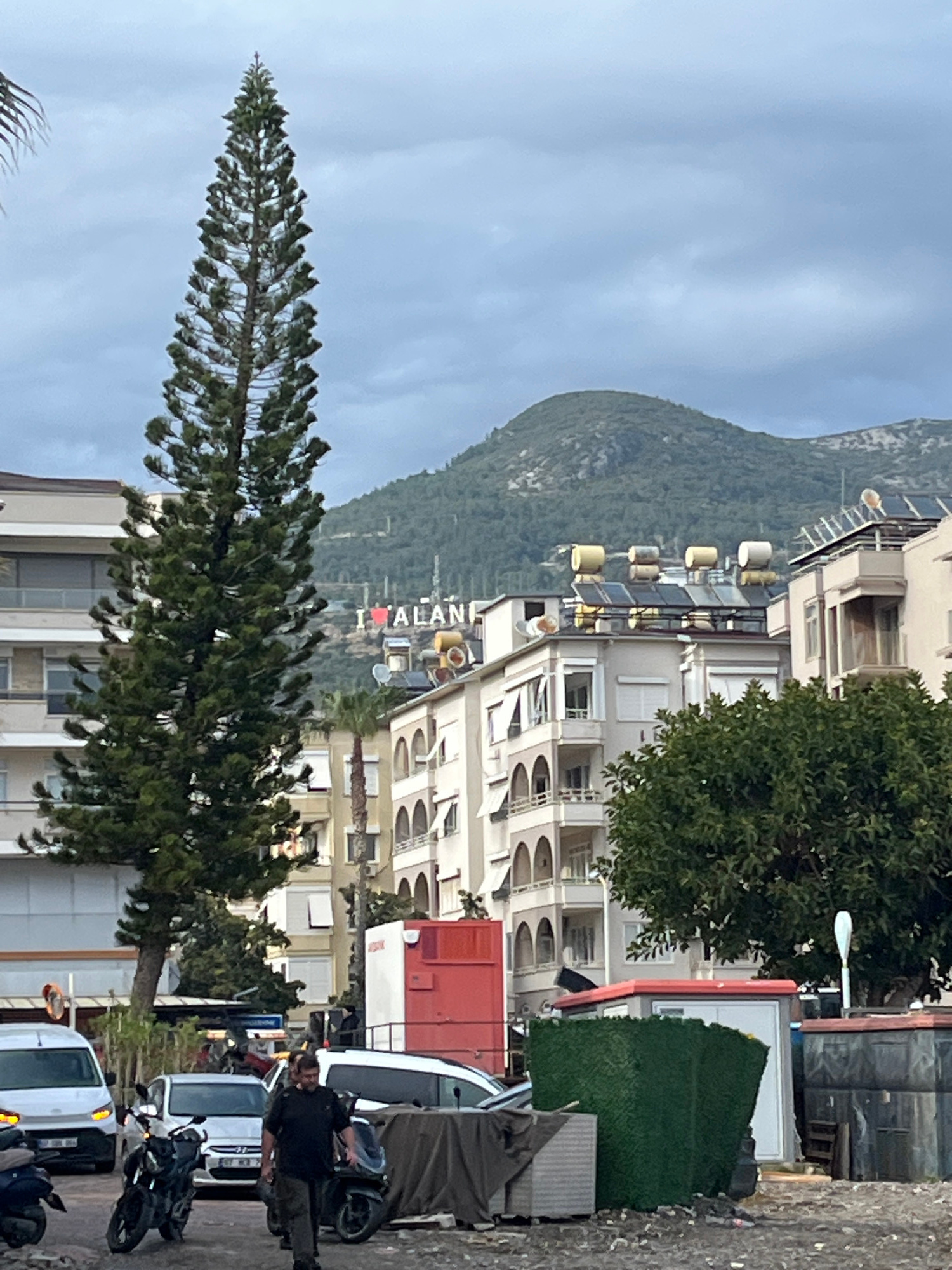 The image shows a street in Alanya, Turkey. In the background is a mountain range. A tall, slender pine tree is in the foreground on the left. Several multi-story buildings line the street, with an "Iā¦read more