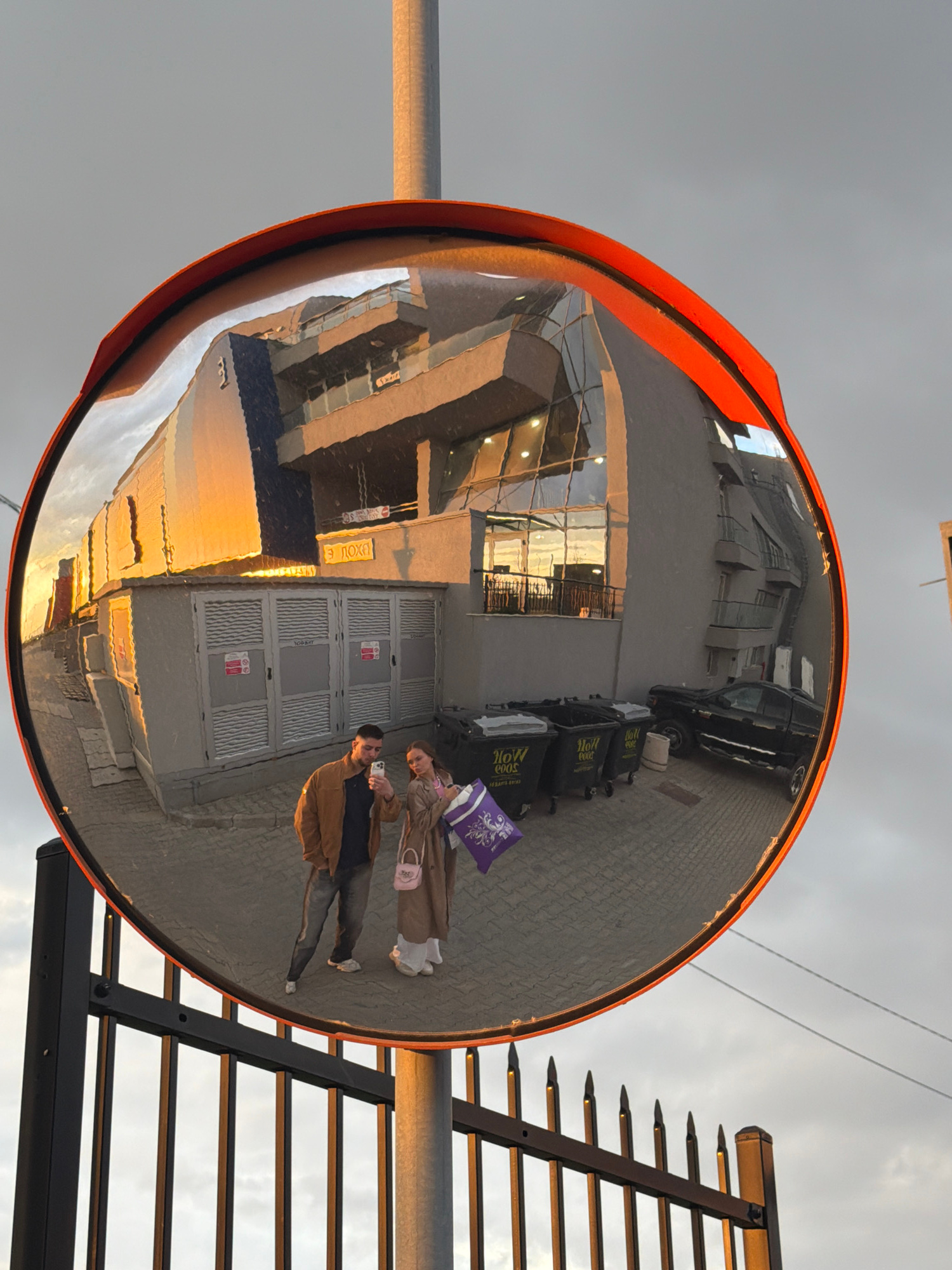 The image displays an urban scene in Sofia, Bulgaria, captured through the distorting reflection of a large, circular convex mirror with a bright orange rim. The mirror is affixed to a metal pole on t…read more