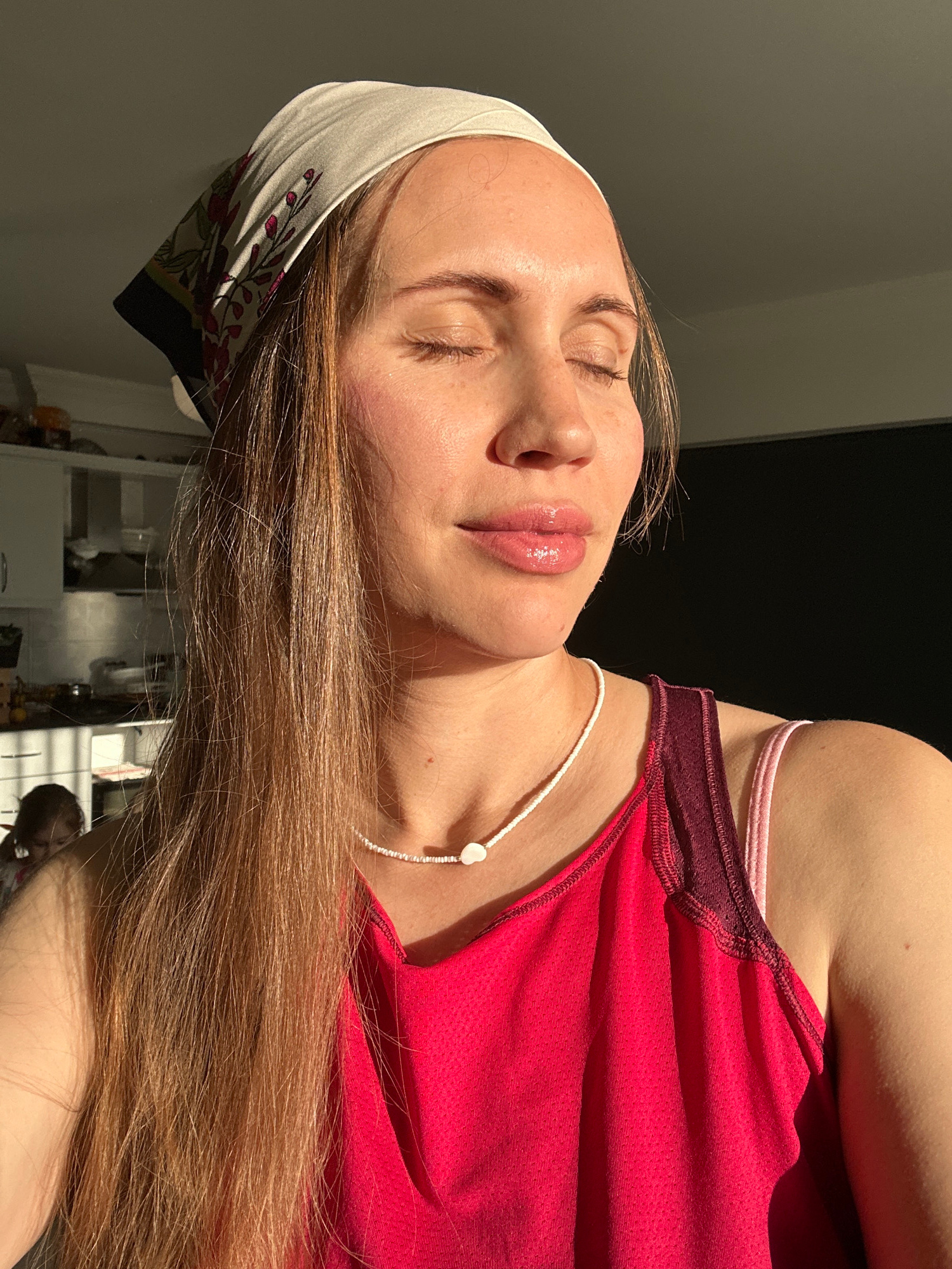 A chest-up portrait depicts a woman in an indoor setting in Fethiye, Turkey. The woman has her eyes closed and a slight smile on her glossy, parted lips. Direct sunlight illuminates the right side of…read more
