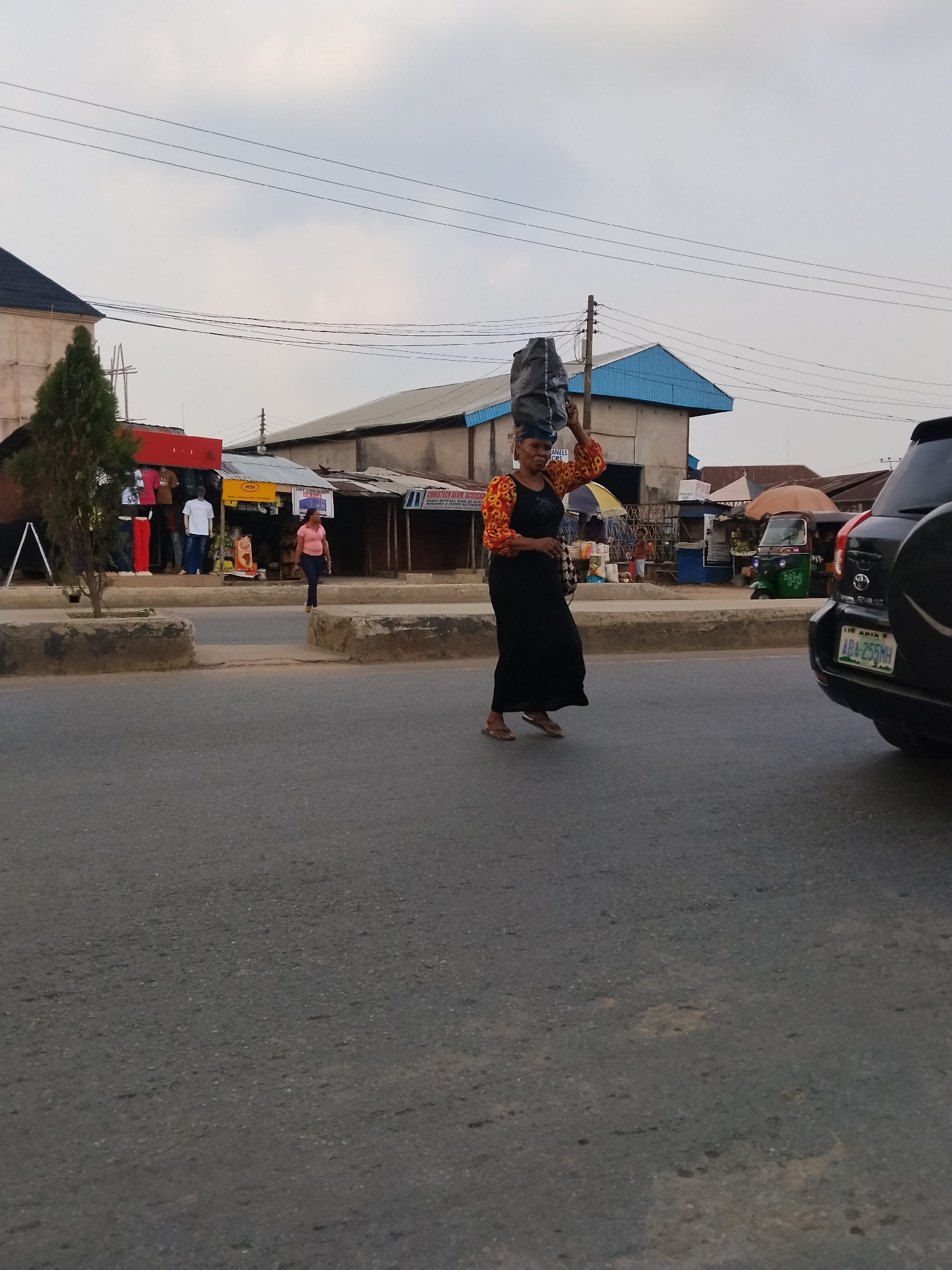 A woman is walking on the road in Aba, Nigeria. She has a black bag on her head, and is wearing a colorful top and a black skirt. There is a car on the right side of the image. Shops line the road in…read more
