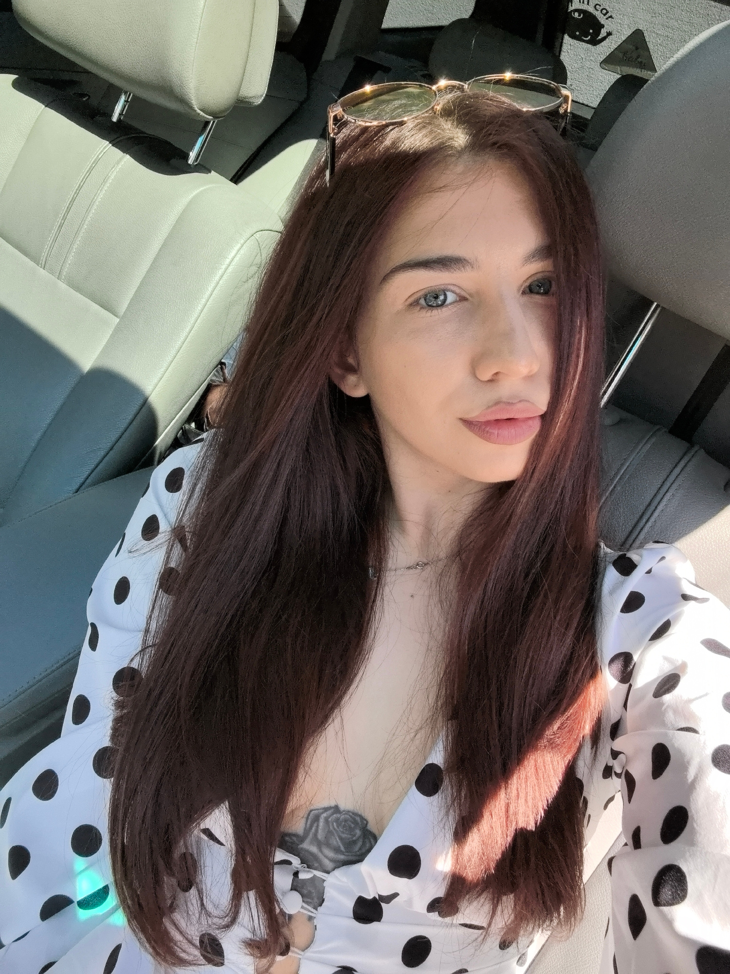 A medium close-up shot shows a woman in the driver’s seat of a vehicle. She has fair skin, blue eyes, and long, auburn hair. Sunglasses are perched on her head. She is wearing a white blouse with blac…read more