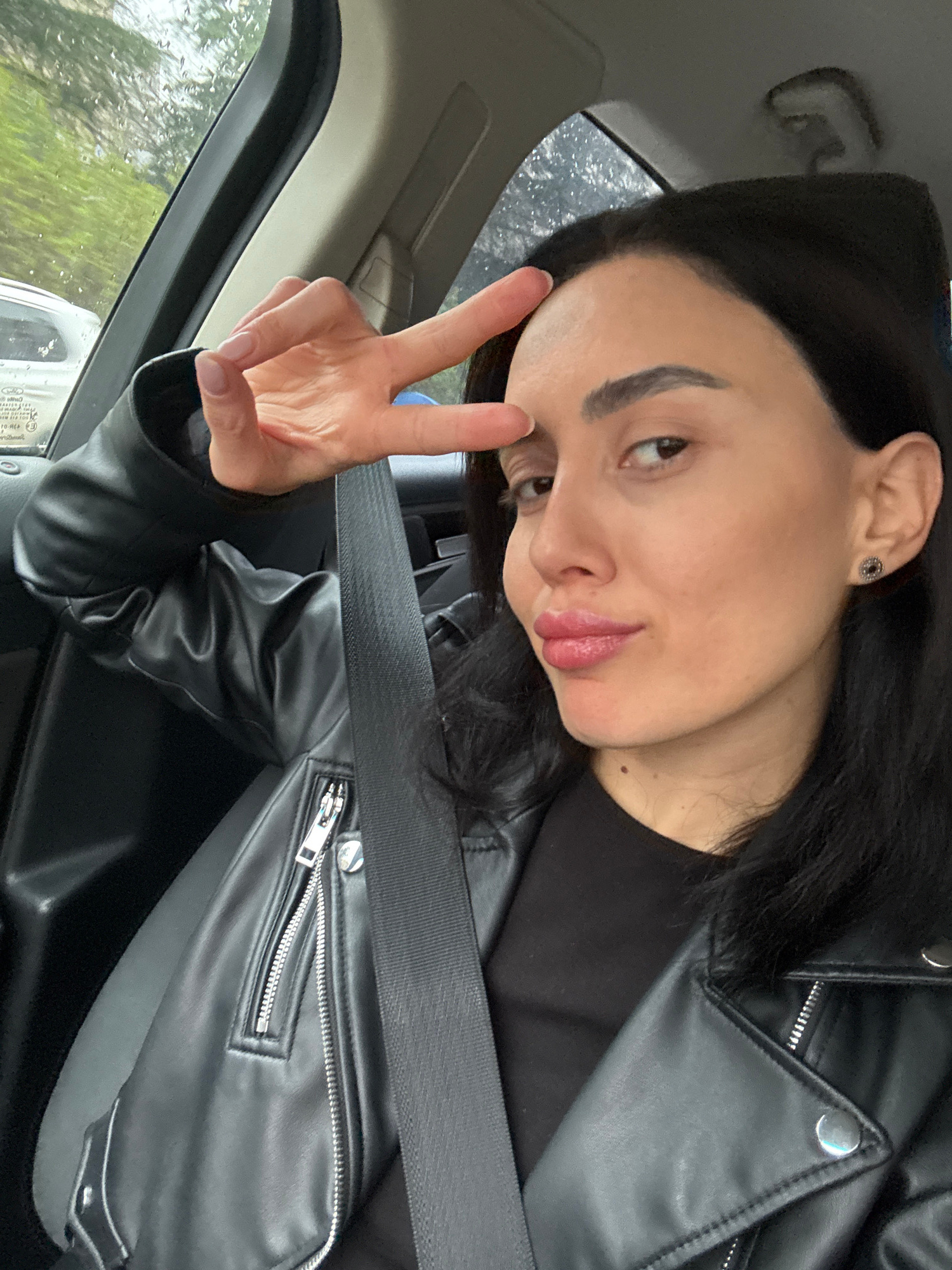 A young woman is in a car, wearing a black leather jacket and a seatbelt. She is holding up a peace sign. It's raining outside, and the view from the car window shows greenery, suggesting an area with…read more