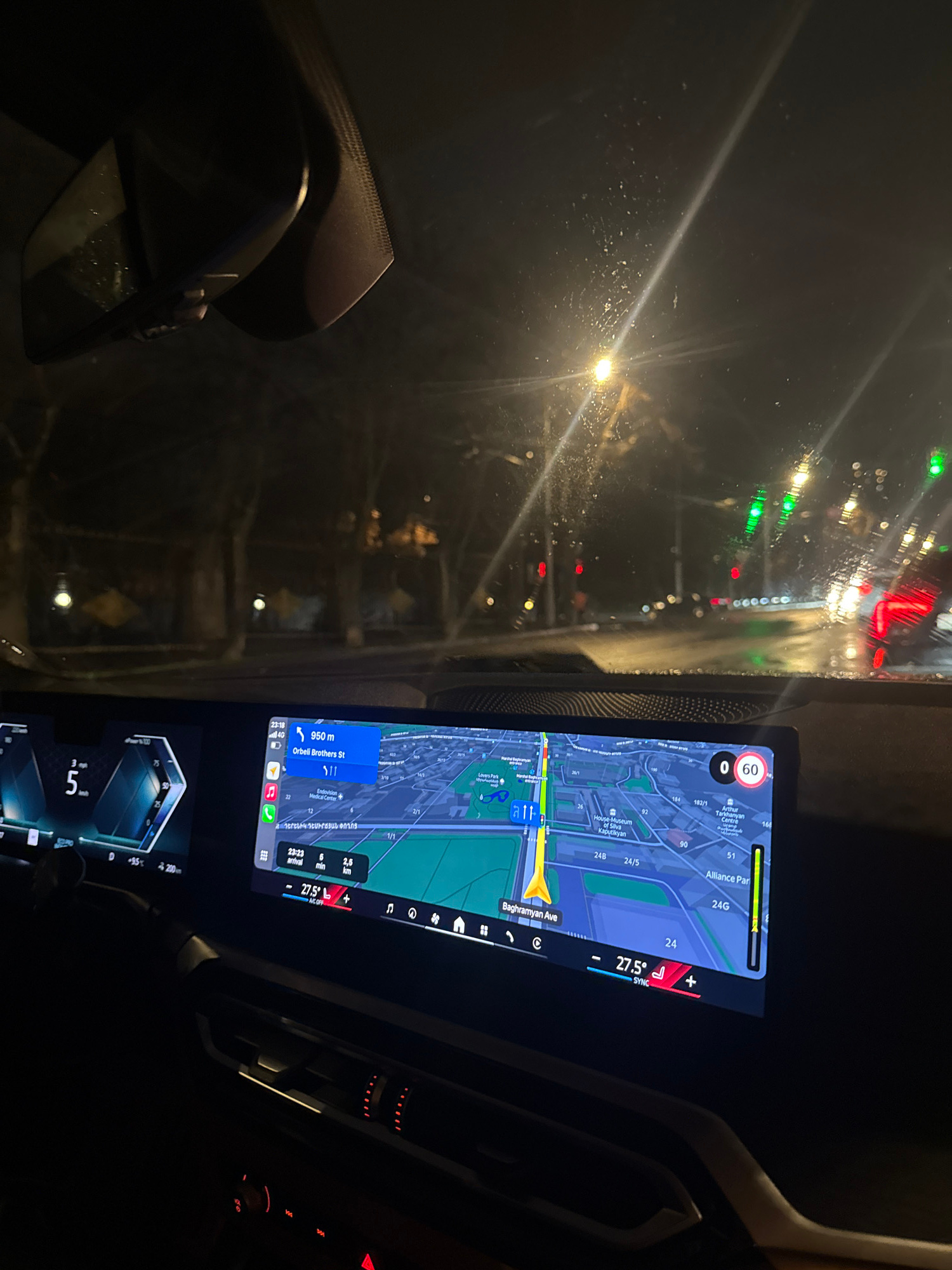 The image depicts the interior of a vehicle, likely a car, in Yerevan, Armenia, at night. The driver-side dashboard is visible, with the rearview mirror in the lower left corner. The car's infotainmen…read more