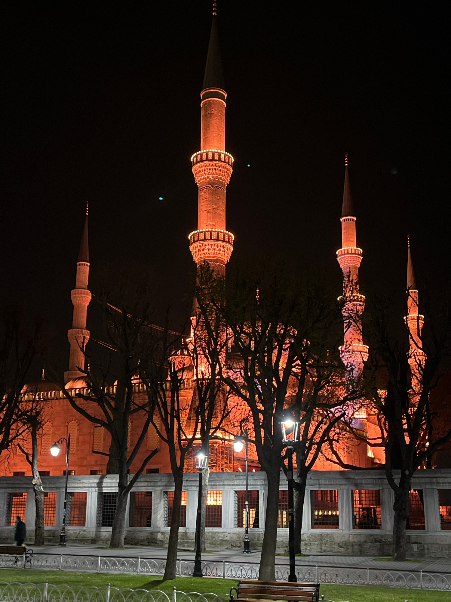 The image depicts the Blue Mosque (Sultan Ahmed Mosque) in Istanbul, Turkey, at night. Four minarets are visible, illuminated with orange light. Bare tree branches are silhouetted against the mosque a…read more