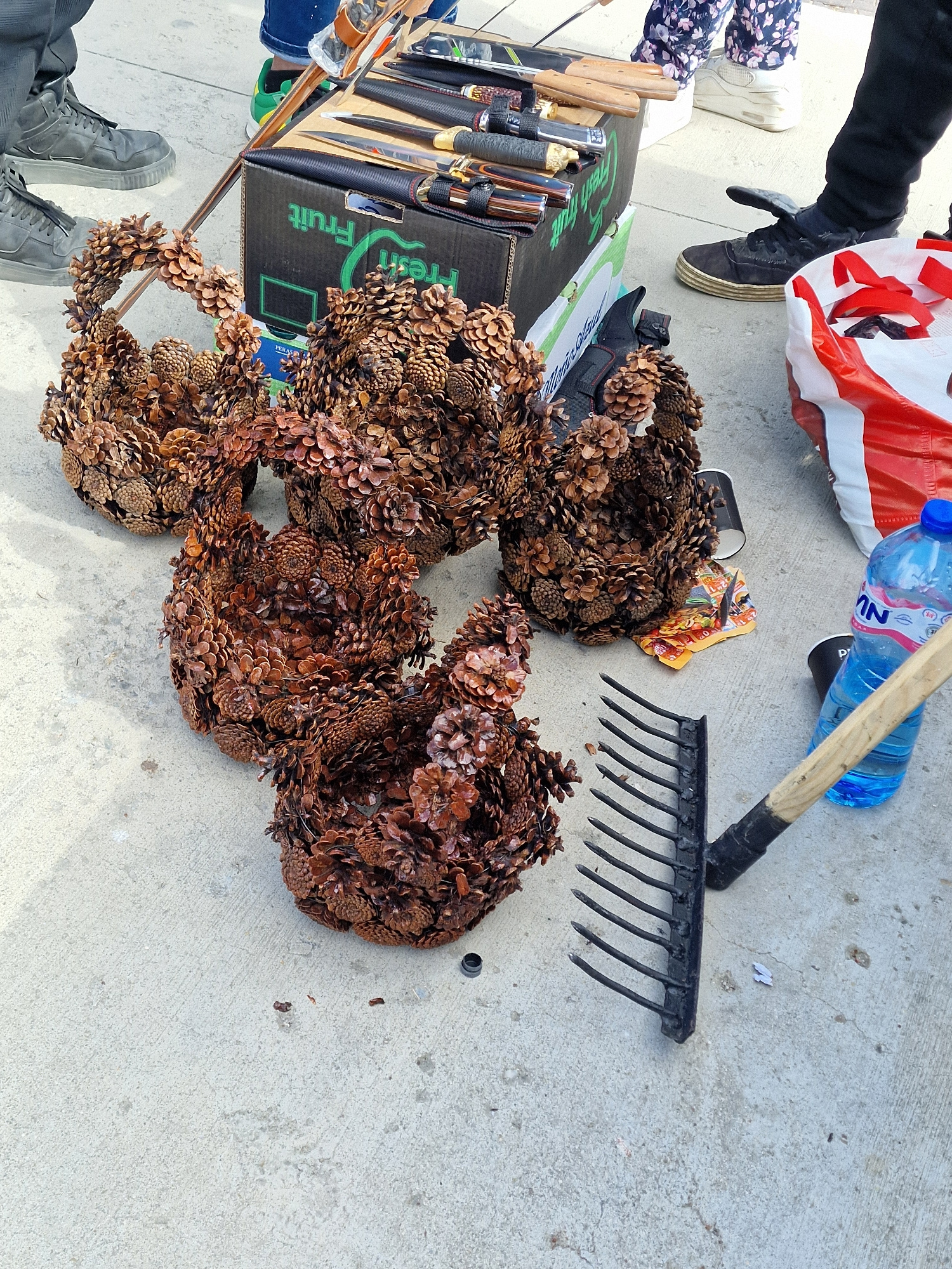 The image shows a collection of items on a concrete surface. There are four wreath-like objects made of pine cones, a black rake with a wooden handle, a blue water bottle, and a red and white shopping…read more