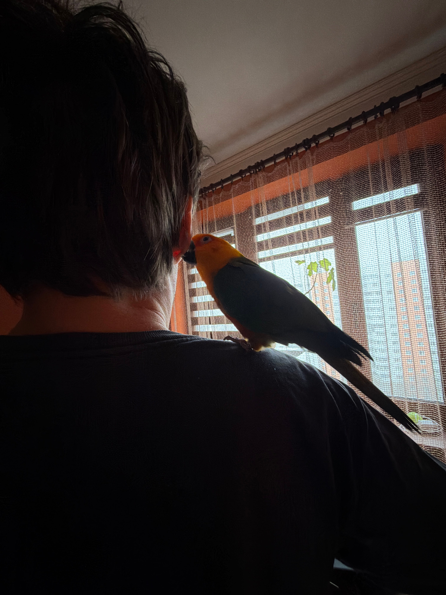 A medium shot angled upward shows a person lying down with a bird perched on their shoulder. The person has dark hair and a light-skinned neck. The bird is a Sun Conure, with a yellow head and green b…read more