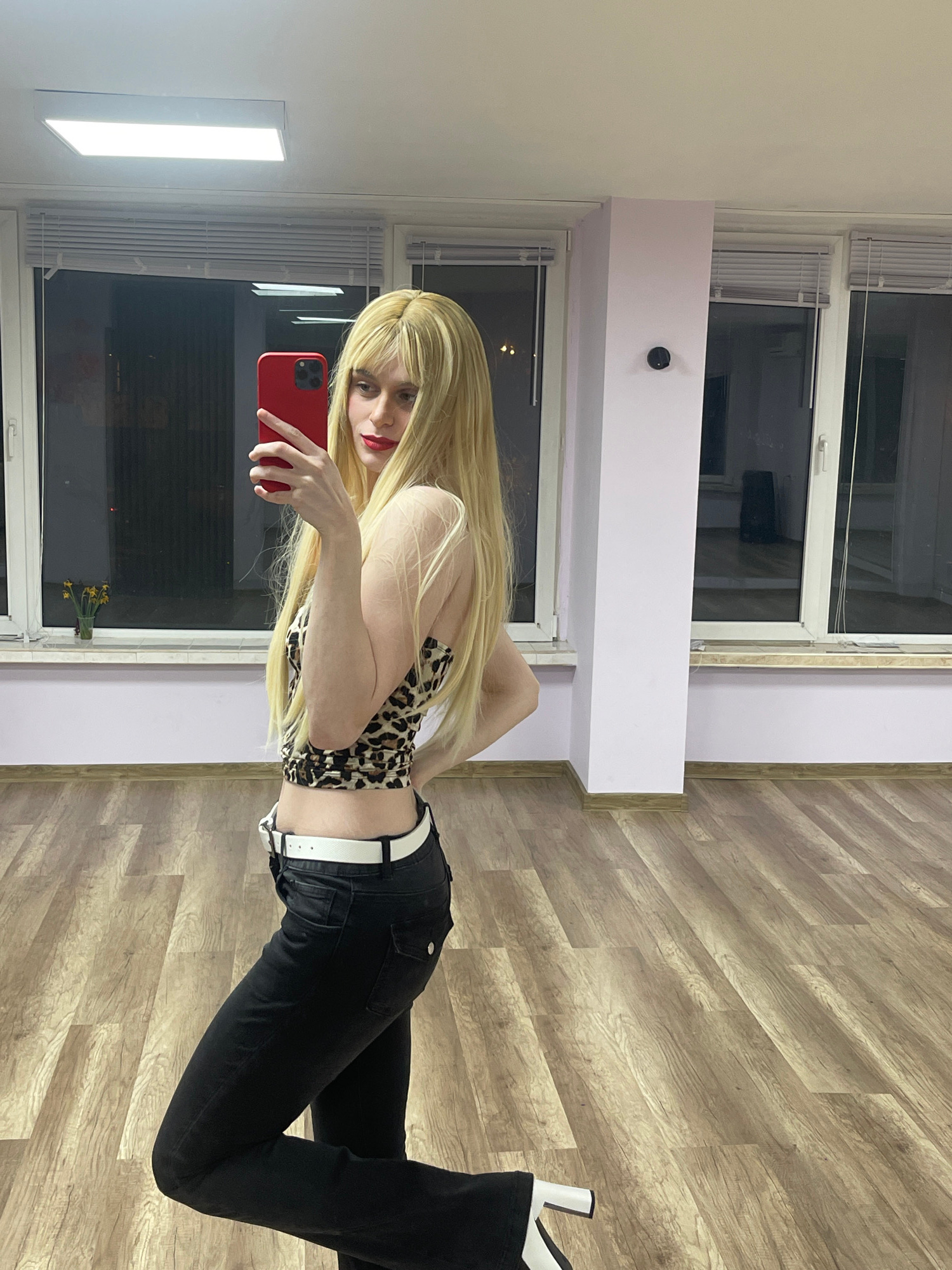 A fair-skinned person with long blonde hair is taking a selfie with a red smartphone. They are wearing a leopard-print top, black jeans with a white belt, and white high heels. The background shows a…read more