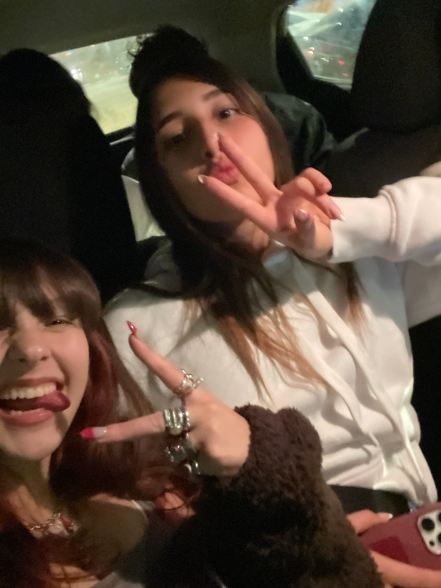 Two young women pose close together for a selfie. One woman, with long brown hair, is positioned at the top of the frame and is wearing a white sweatshirt. She is making a peace sign with her fingers.…read more