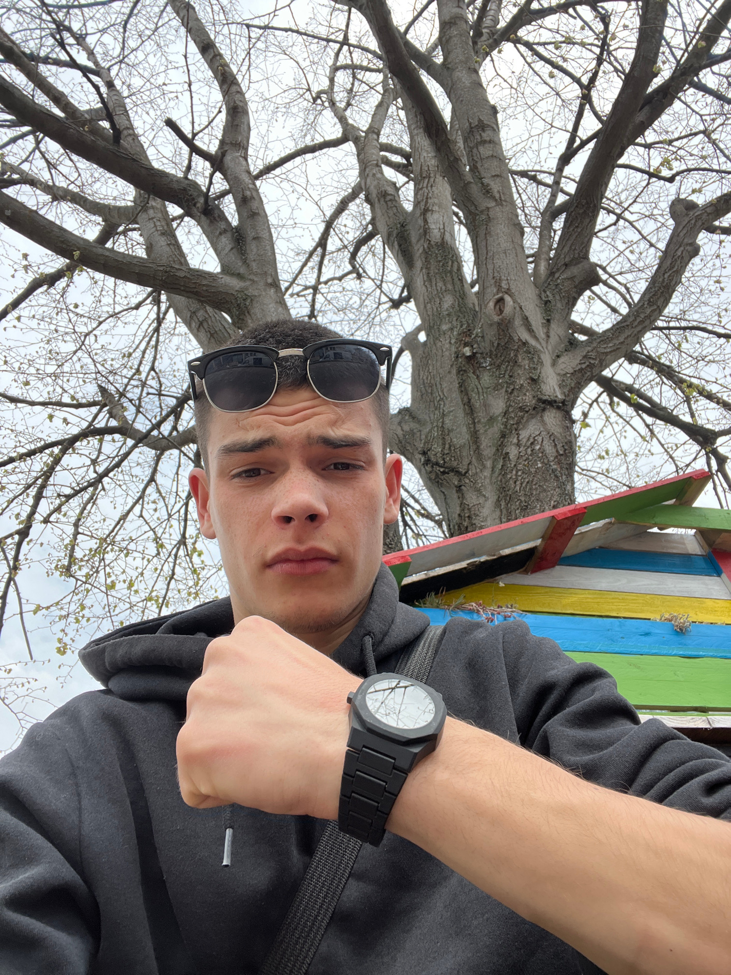 A young man takes a selfie, angled upward towards a large tree with bare branches and a grey sky. The man has short dark hair, sunglasses perched on his head, and is wearing a grey hoodie and a black…read more