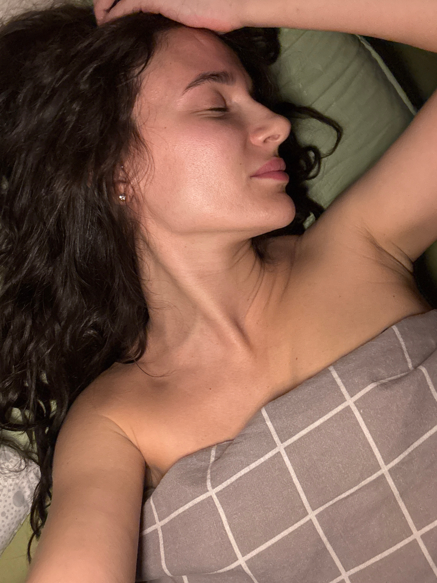 A woman is lying down, facing left. She has dark, curly hair and is partially covered by a grey blanket with a white grid pattern. Her right arm is raised. The background appears to be a green pillow…read more