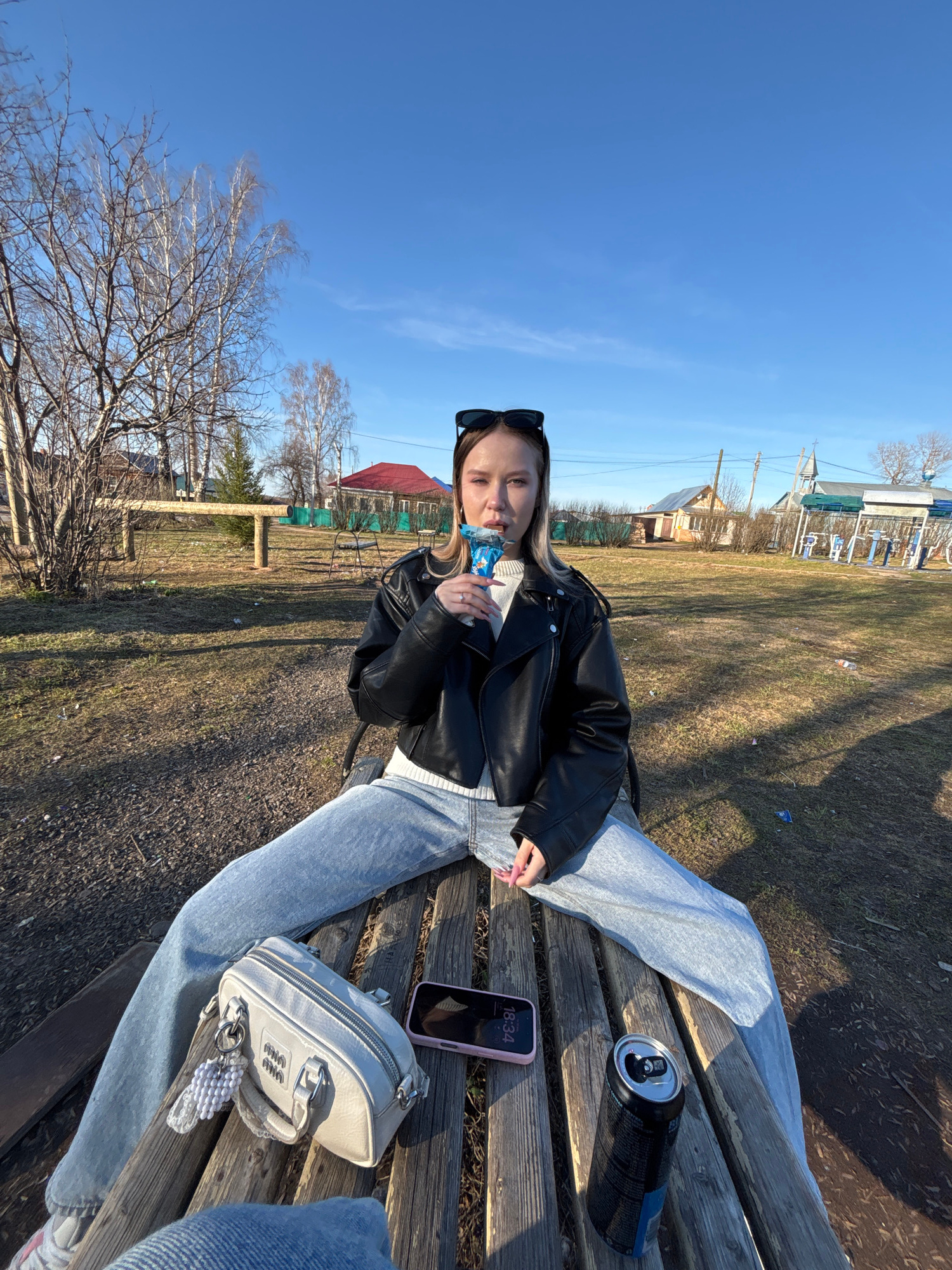 An outdoor image captures a young woman relaxing on a wooden park bench under a clear blue sky, likely in Фоки, Russia. She has light-colored hair, is wearing a black leather jacket over a white sweat…read more