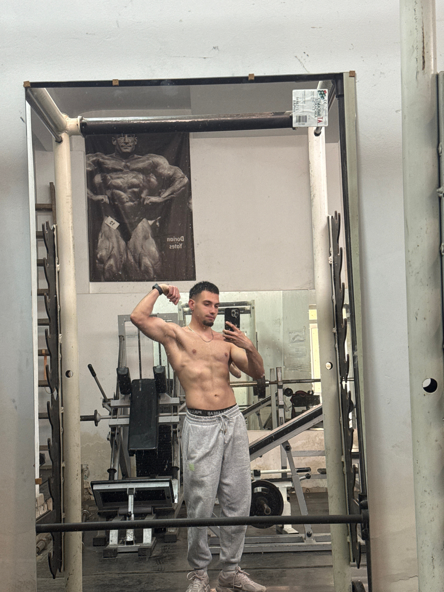 A man poses shirtless in front of a gym mirror. He is wearing grey sweatpants and sneakers. The mirror reflects weightlifting equipment and a black and white poster of a muscular figure. A sticker on…read more
