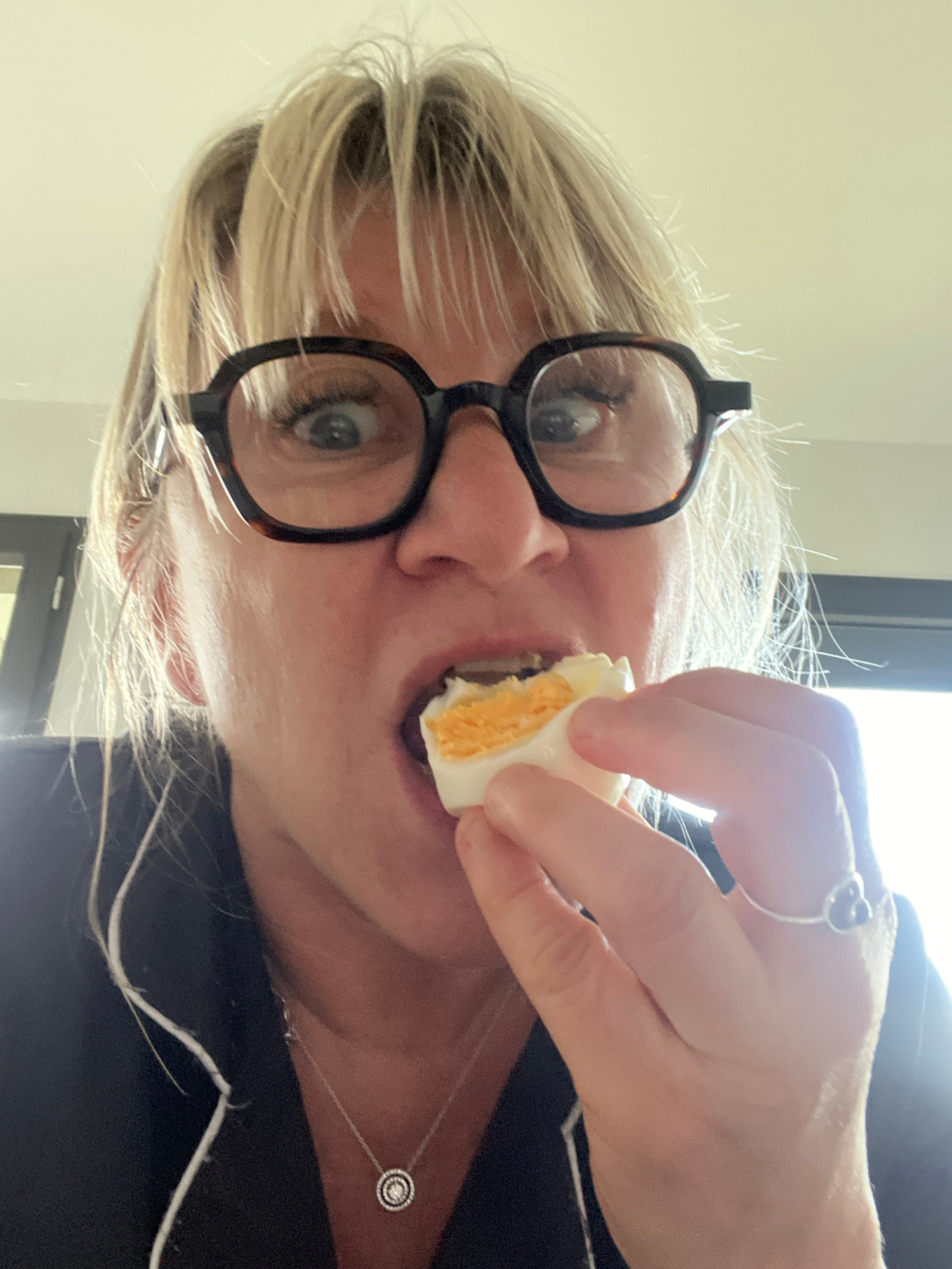 A woman with blonde hair and glasses is holding a slice of hard-boiled egg in front of her mouth. She is wearing a black shirt with white piping and a silver necklace. A ring is visible on her right h…read more