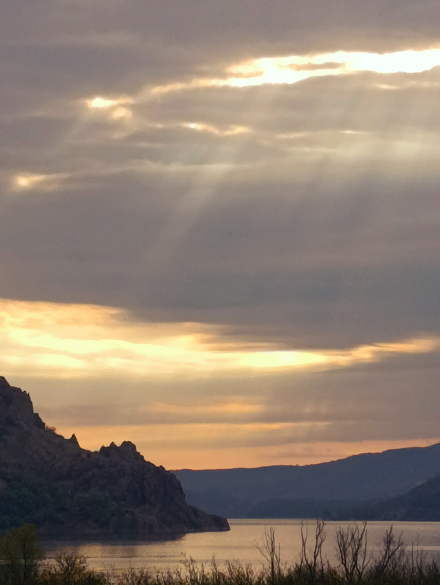 The image is a landscape featuring a body of water, likely a lake or river, with a rocky promontory or cliff extending into the water on the left. A distant mountain range or hills are visible across…read more
