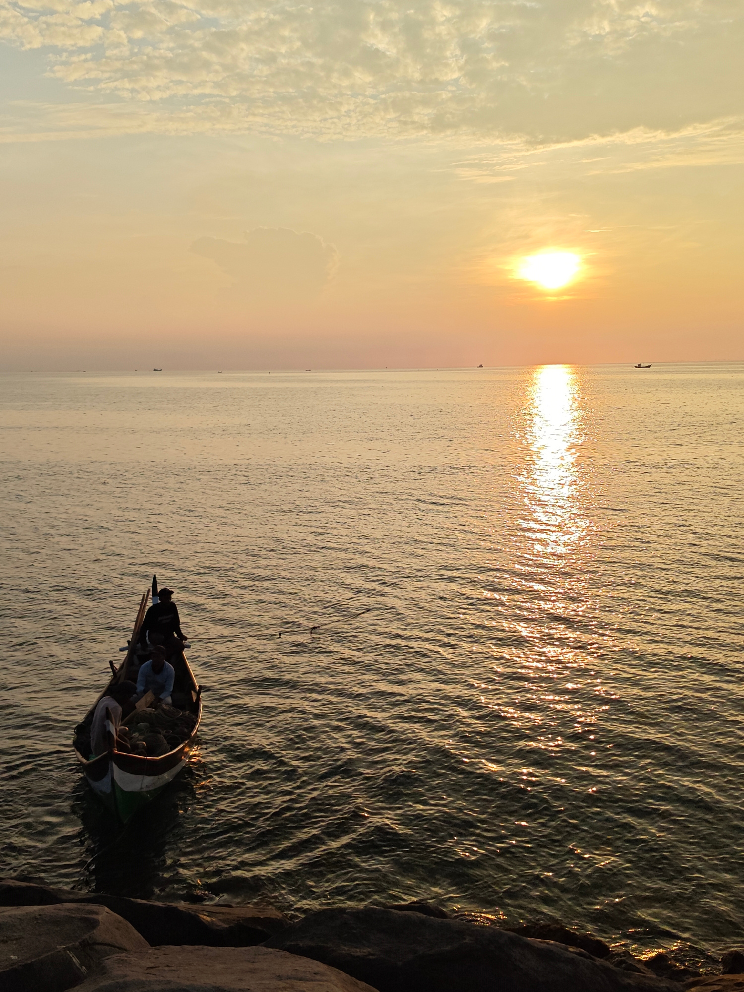 The image depicts a sunset over the ocean, likely in the coastal city of Lhokseumawe, Indonesia. In the foreground, a small fishing boat is visible, occupied by several individuals. The boat is positiβ¦read more
