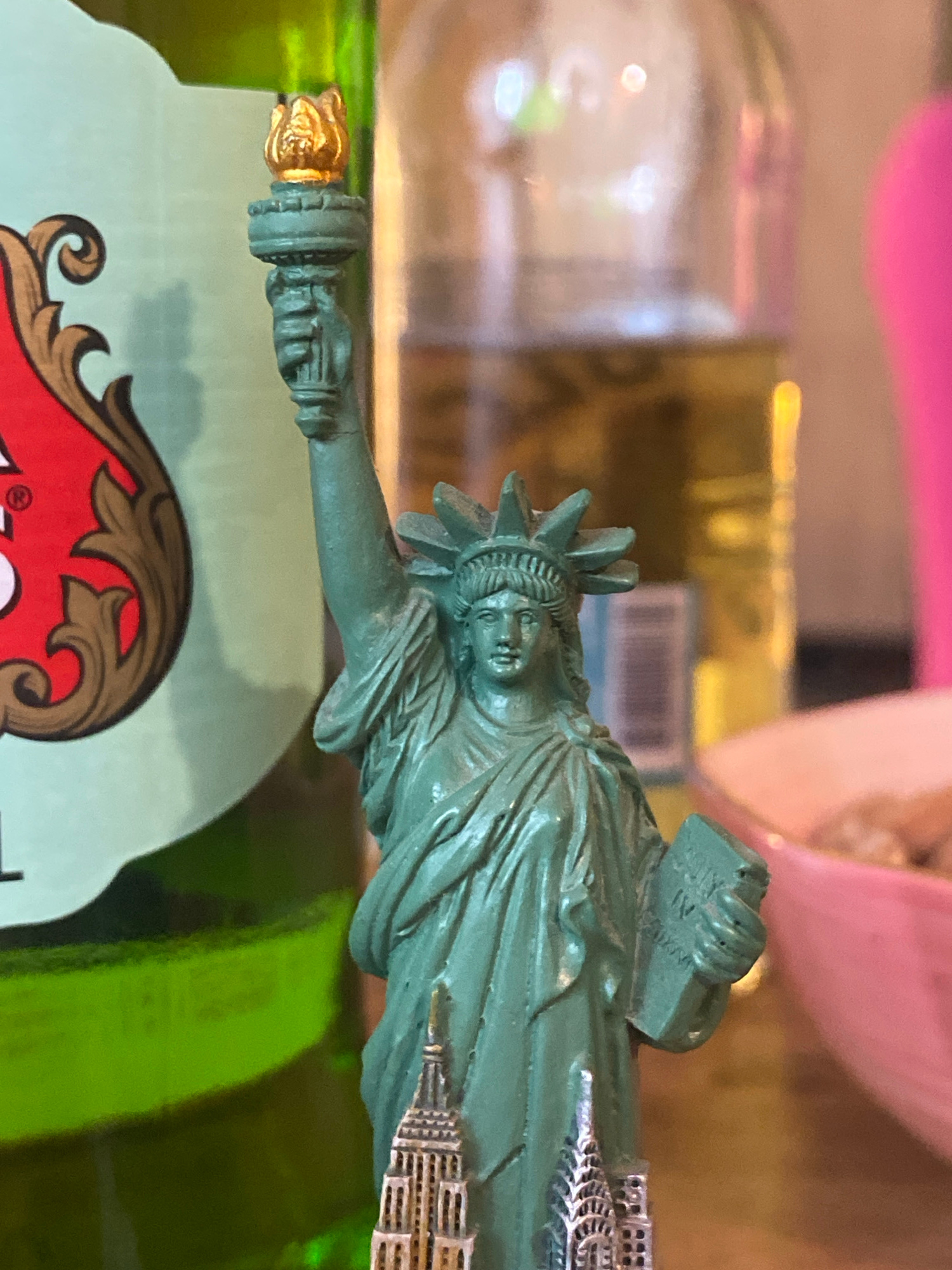 A close-up photograph depicts a souvenir statue of the Statue of Liberty, with its signature green patina and golden torch, resting on what appears to be a green bottle with a red and brown label. The…read more