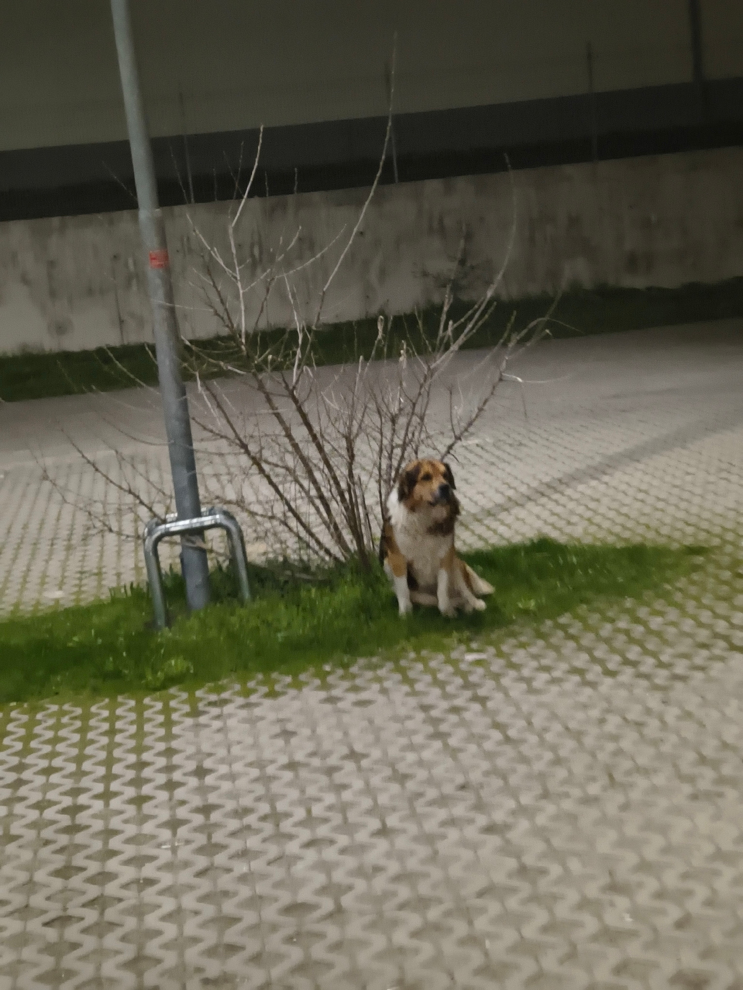 A sideways, medium-shot depicts a calico cat nestled in the grass near a tree and a metal pole. The location appears to be outdoors, in a space with a patterned, paved ground. The lighting suggests it…read more