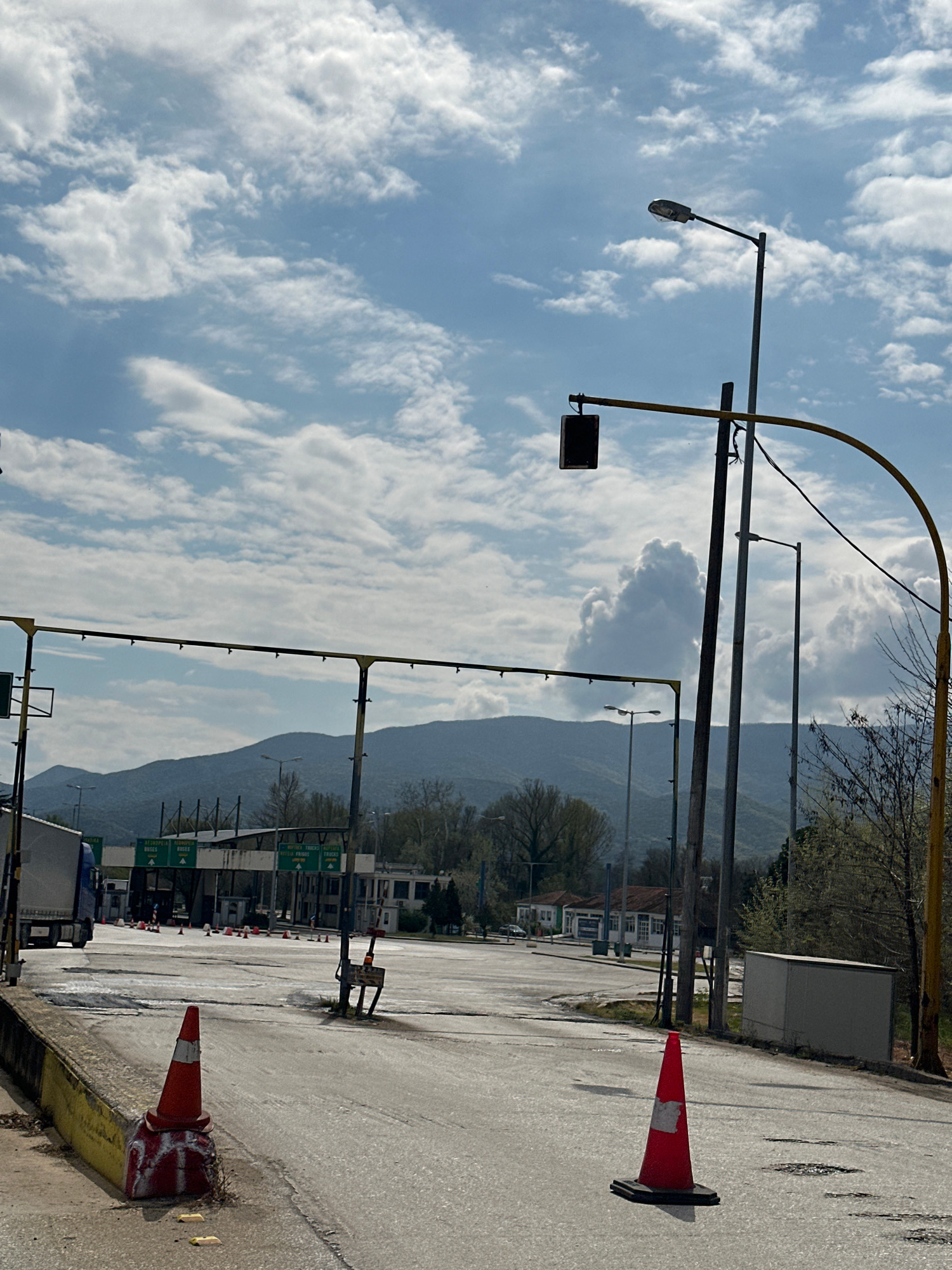 The image shows a highway toll booth in the Δημοτική Ενότητα Προμαχώνος, Greece. The scene includes multiple toll lanes with signage in Greek. Two traffic cones are present in the foreground: one on t…read more