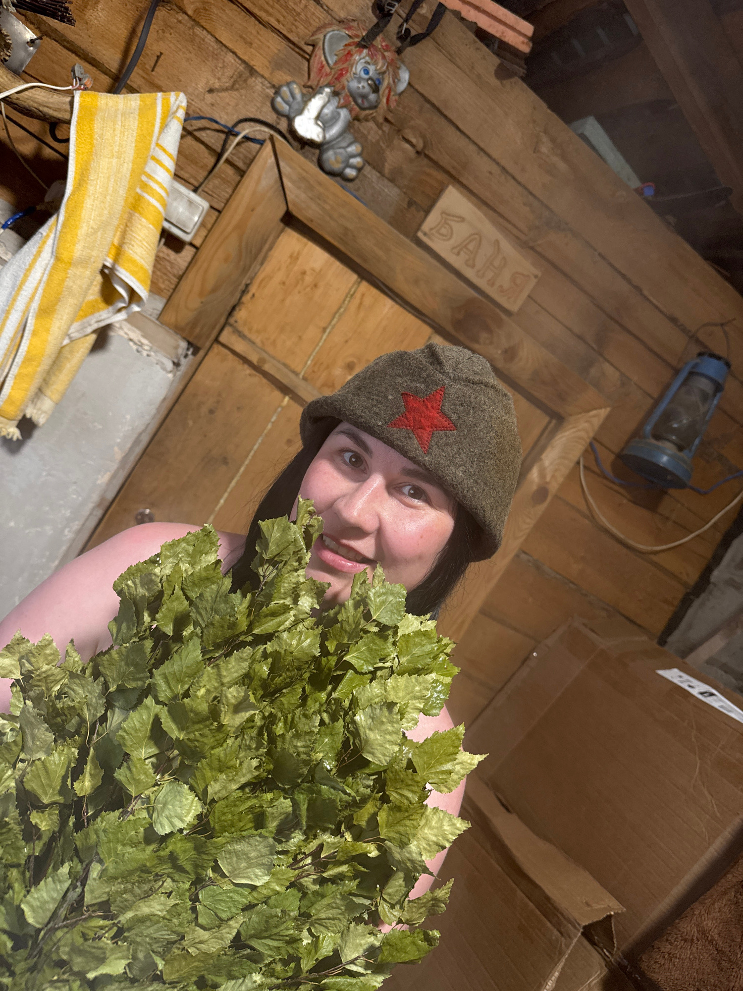 A woman wearing a green hat with a red star is holding a bunch of leafy branches. She is in a wooden sauna (indicated by the Cyrillic word "БАHЯ" engraved on the wooden wall). There is a towel, a toy,…read more