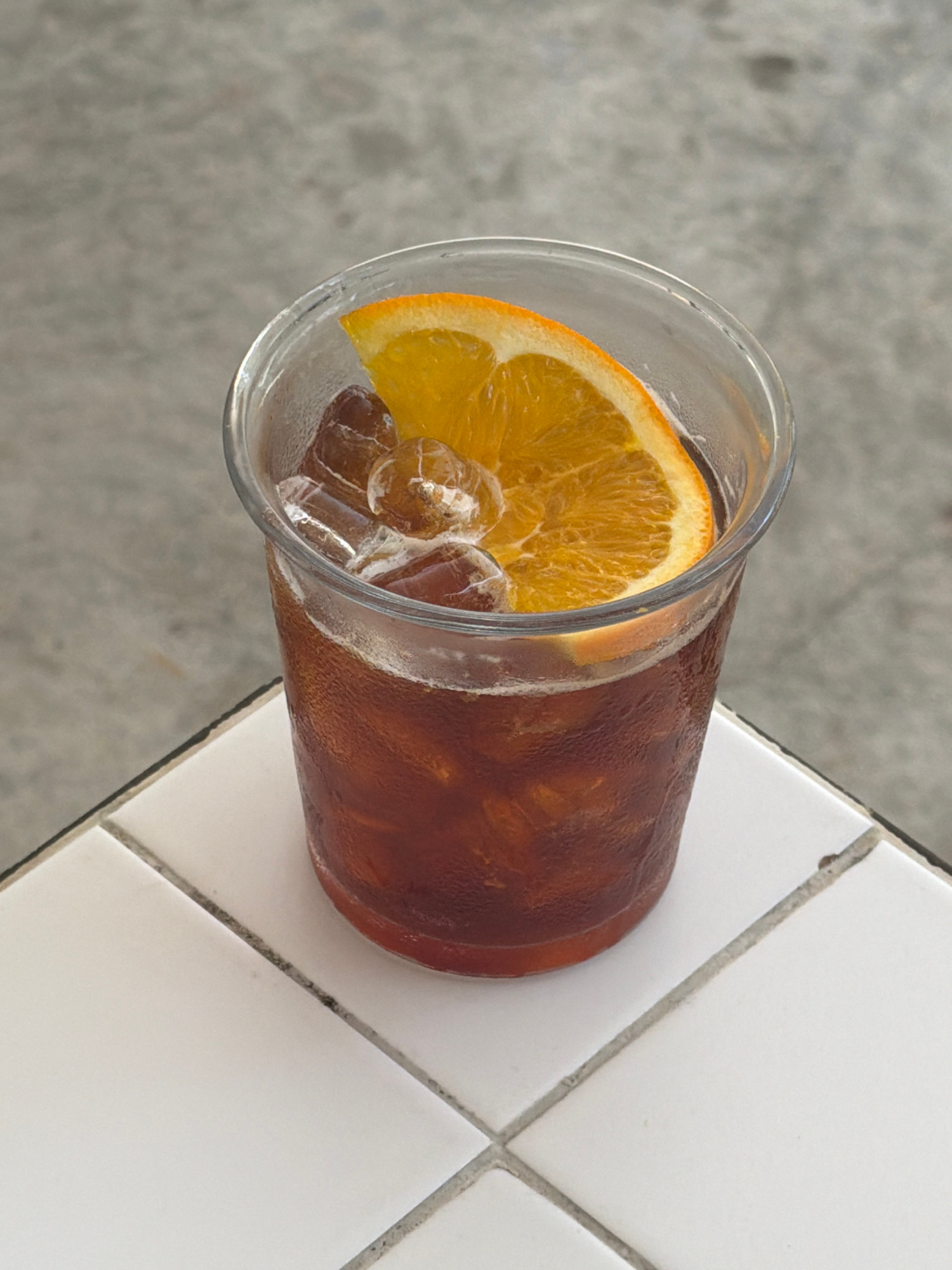 A high-angle shot shows a clear plastic glass filled with a dark brown liquid, likely iced coffee, and garnished with an orange slice and ice cubes. The glass is condensation-covered, indicating its c…read more