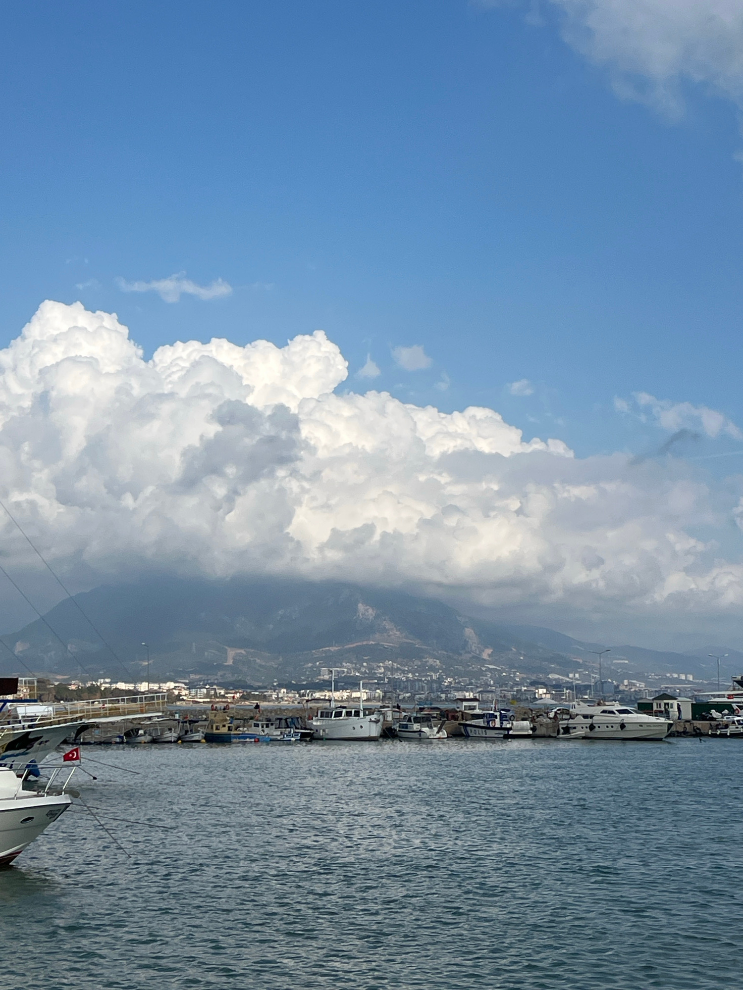 The image shows a view from Alanya, Turkey. The foreground consists of the Mediterranean Sea. Boats, including sailboats, are docked along the harbor. A Turkish flag can be seen on one of the boats. B…read more