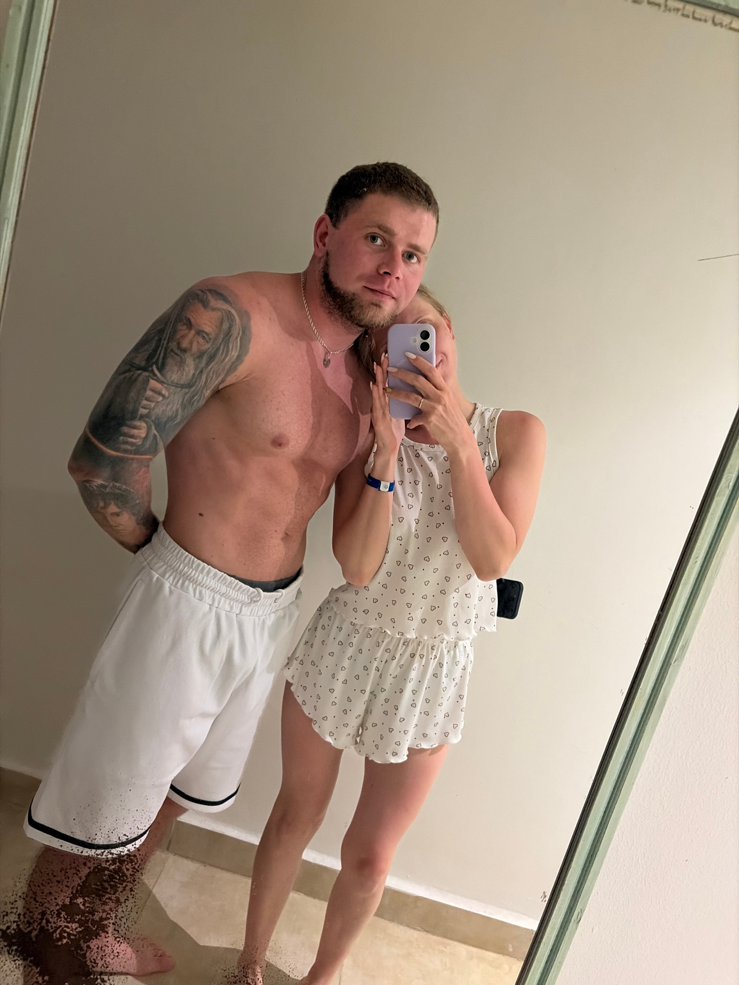 A man and a woman are posing in a selfie in front of a mirror. The man is bare-chested with white shorts, while the woman wears a white dress with a heart pattern. The man has a tattoo on his left arm…read more