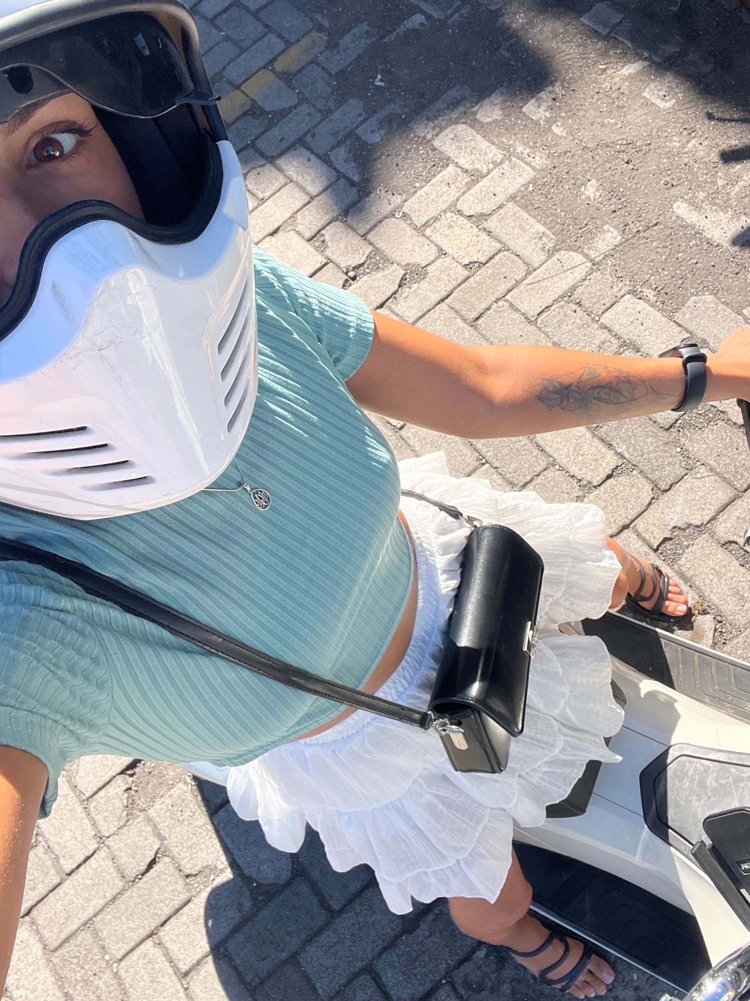 A high-angle shot captures a woman seated on a white moped, likely within the city of Kuta Selatan, Indonesia, as suggested by the local street pavement. The woman wears a light green, short-sleeved r…read more