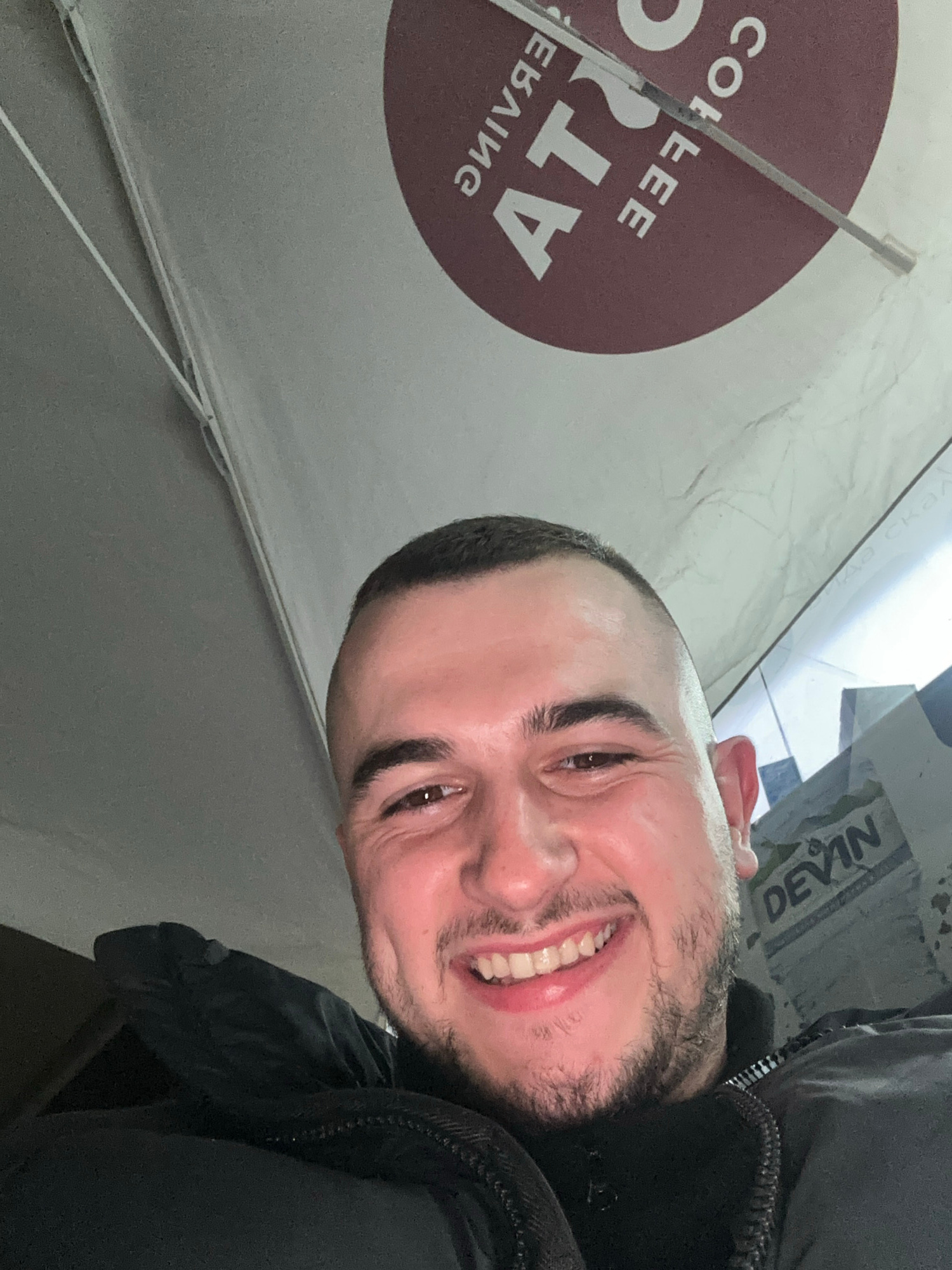 A man smiles into the camera in an indoor setting. Behind him is a sign that reads "Coffee Atelier," suggesting he is likely at or near a coffee shop. The sign's lettering is oriented in reverse, whic…read more