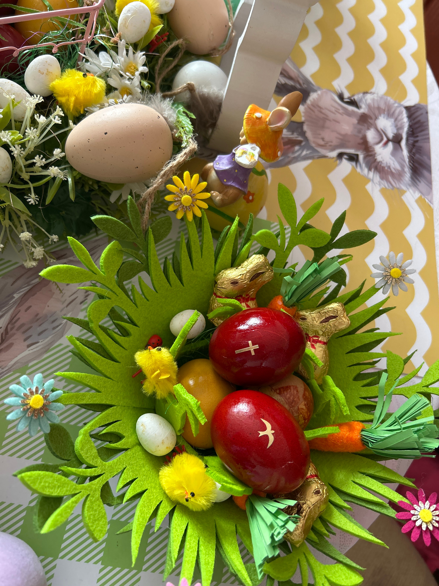 A high-angle, indoor shot shows an Easter-themed decoration. A section of an Easter card depicting an otter stands in the background. A decorated Easter basket contains dyed red eggs, chocolate bunnie…read more