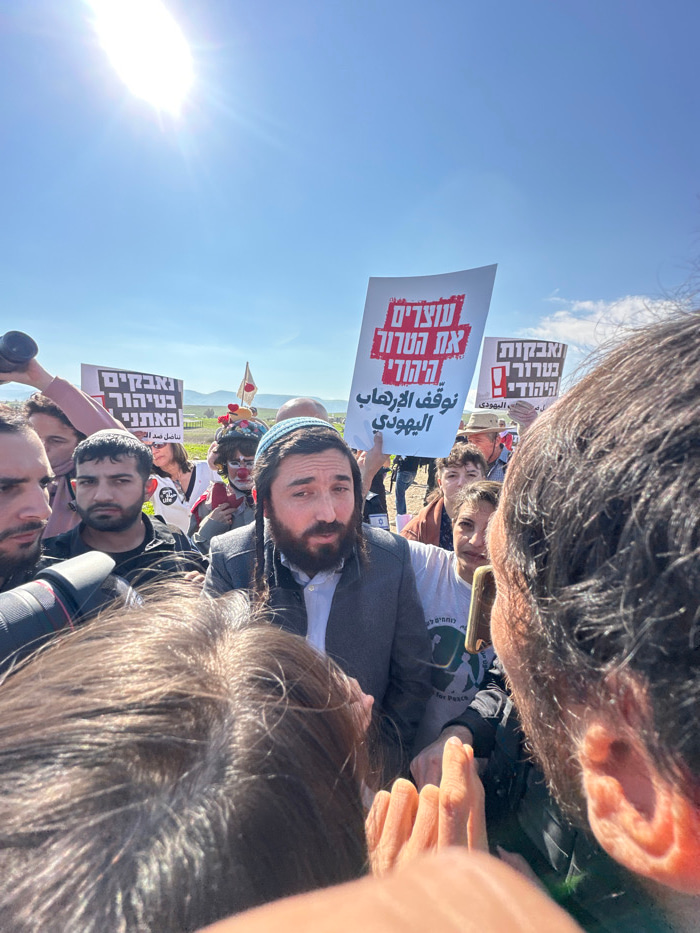 A crowded outdoor gathering is depicted under a bright, sunny blue sky in Ras 'Ein al 'Auja, Palestinian Territory, with the sun prominently visible in the upper left. A central bearded man with peyos…read more