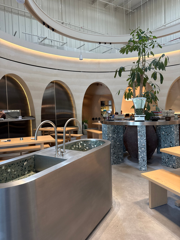 The image depicts the interior of a modern café or restaurant located in Dubai, United Arab Emirates. The scene is characterized by a blend of minimalist and industrial-chic design elements. In the i…read more