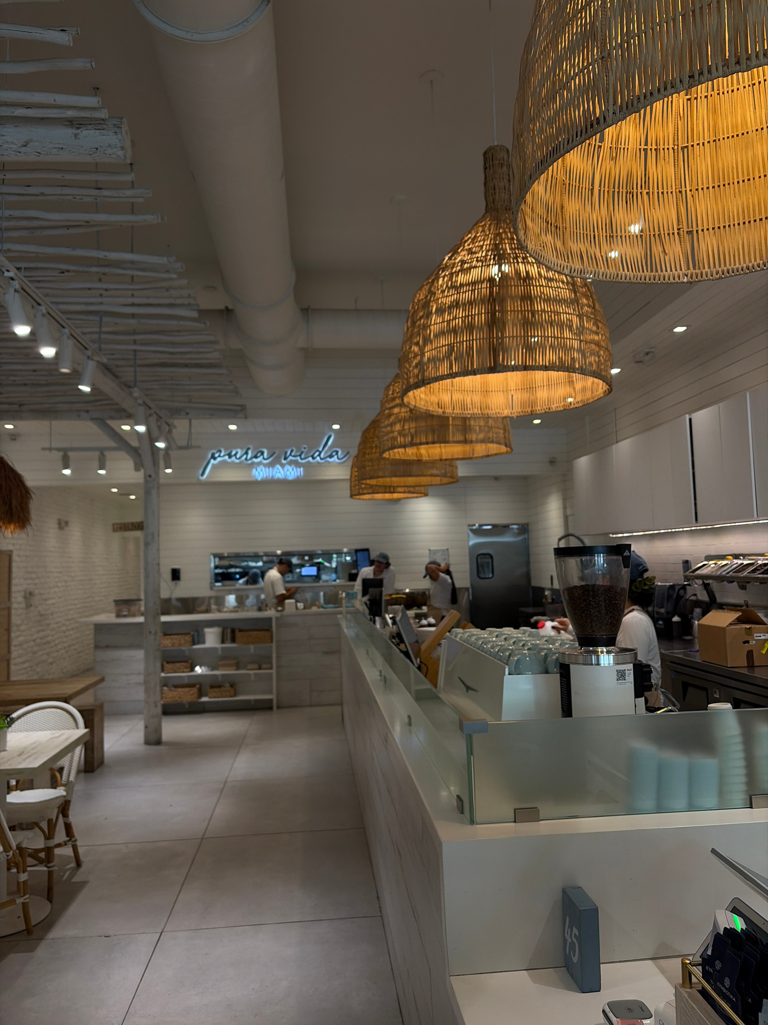 The image shows the interior of a Pura Vida Miami restaurant. Several large, woven light fixtures hang from the ceiling. The restaurant has a bright and airy feel, with white walls and light-colored fâŚread more