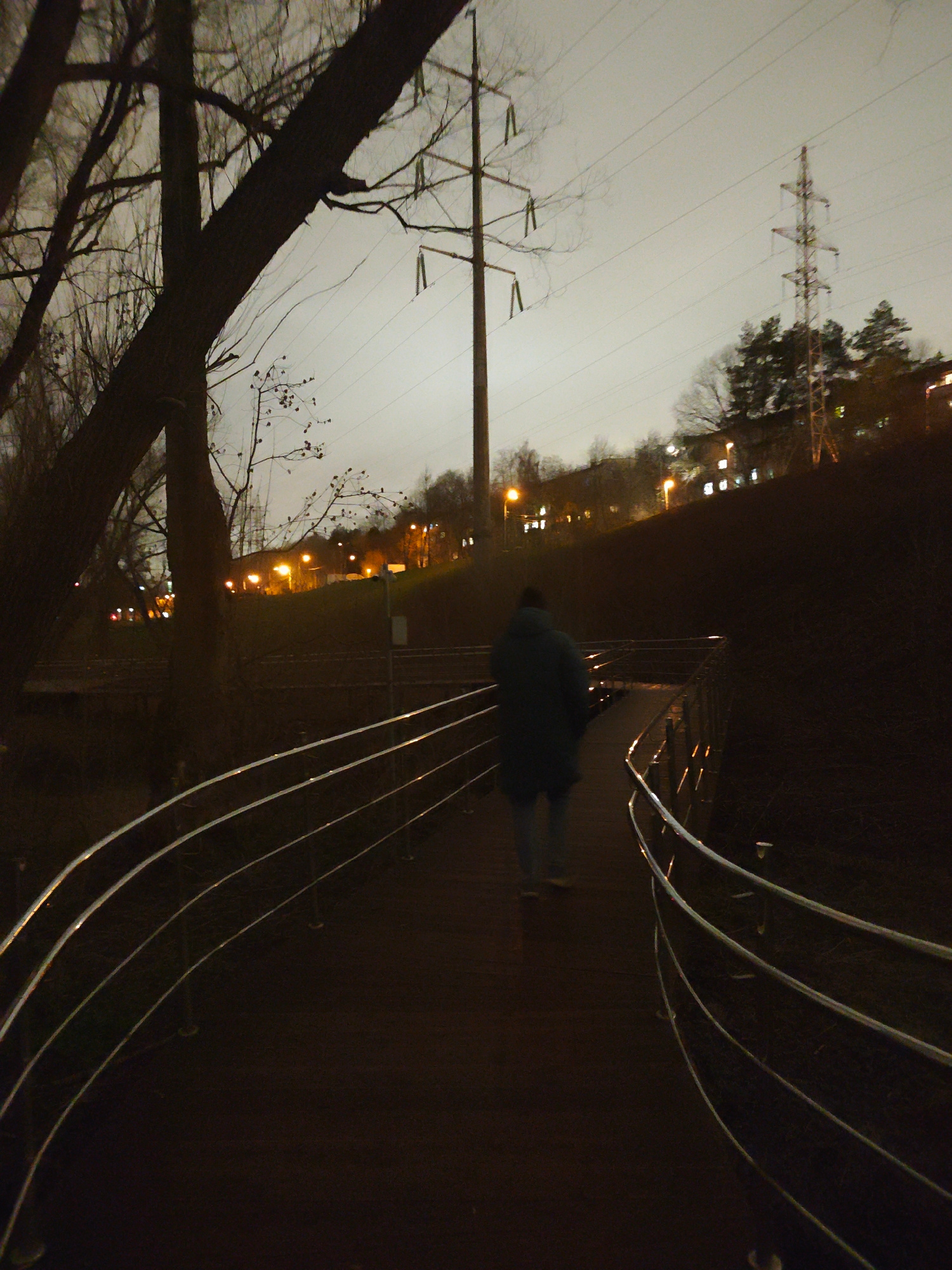 The image shows a person walking along a bridge with metal railings at night. The location appears to be a park or green space in Moscow, Russia. **Details:** * A person is walking away from the vi…read more